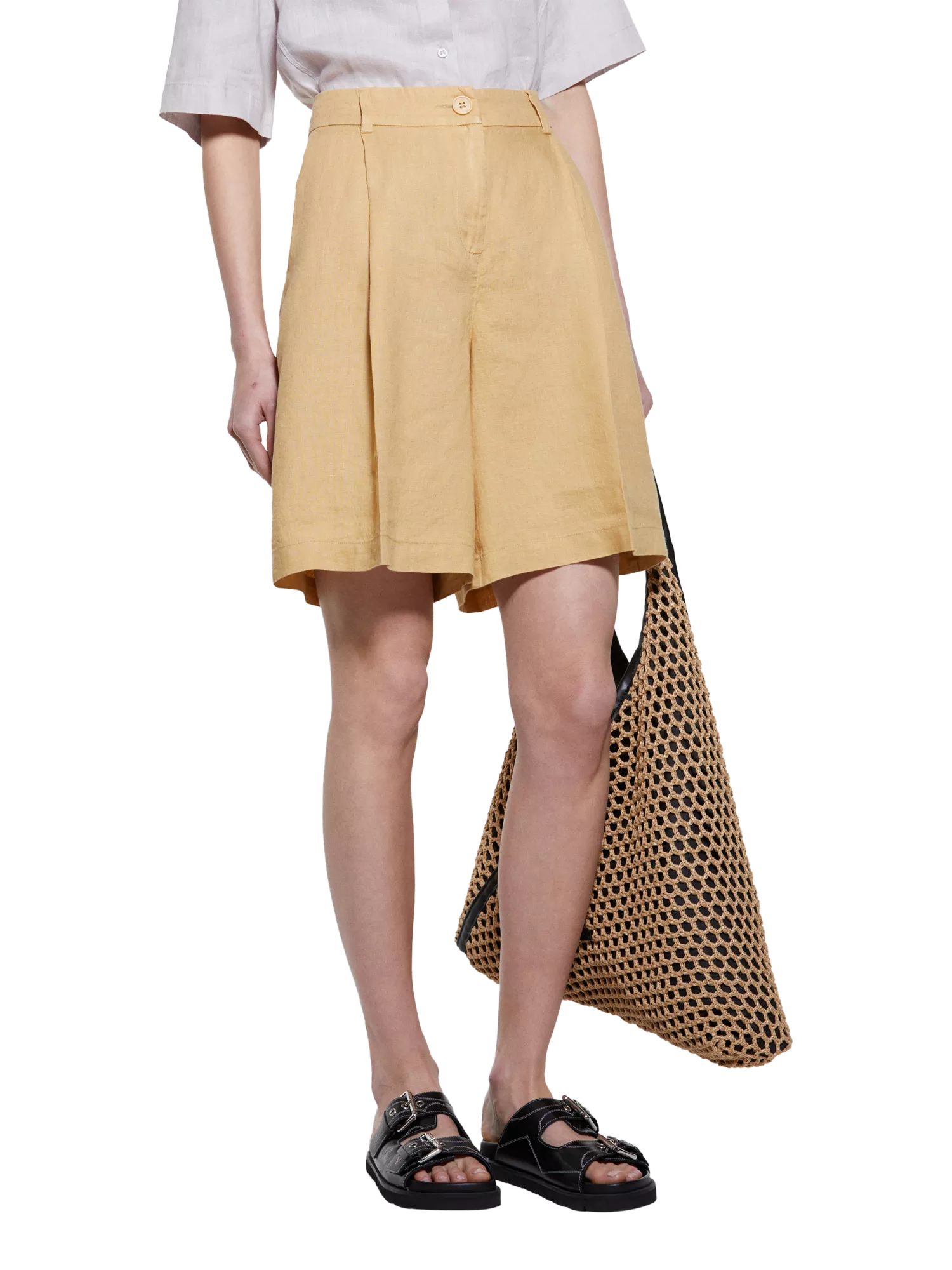SISLEY shorts in 100% linen deliver cool comfort on casual days. High-rise and tailored with cutaway pockets, they fit right in from garden gatherings to city strolls.