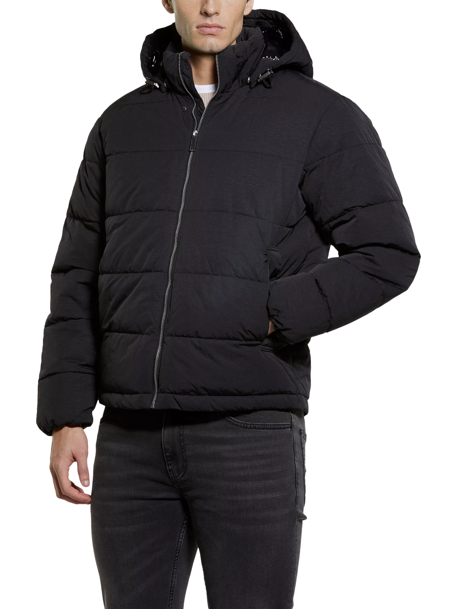 Stay warm in this hooded puffer jacket with eco down padding. Featuring a removable hood and logoed metal details.