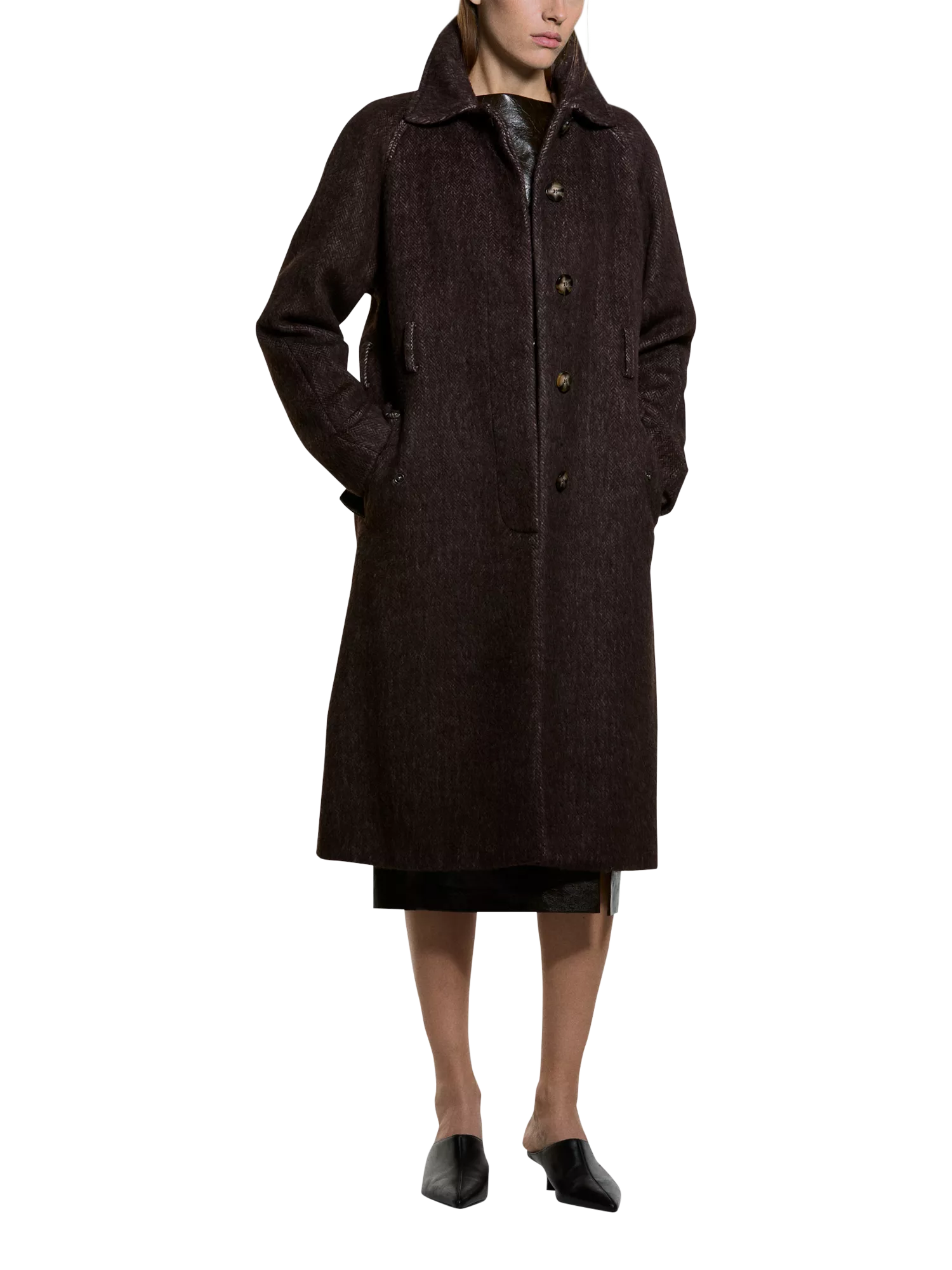 A SISLEY longline overcoat. Made from a wool blend in a regular fit, it features a chevron pattern with raglan sleeves, leather accents, and a classic button fastening for versatile wear.