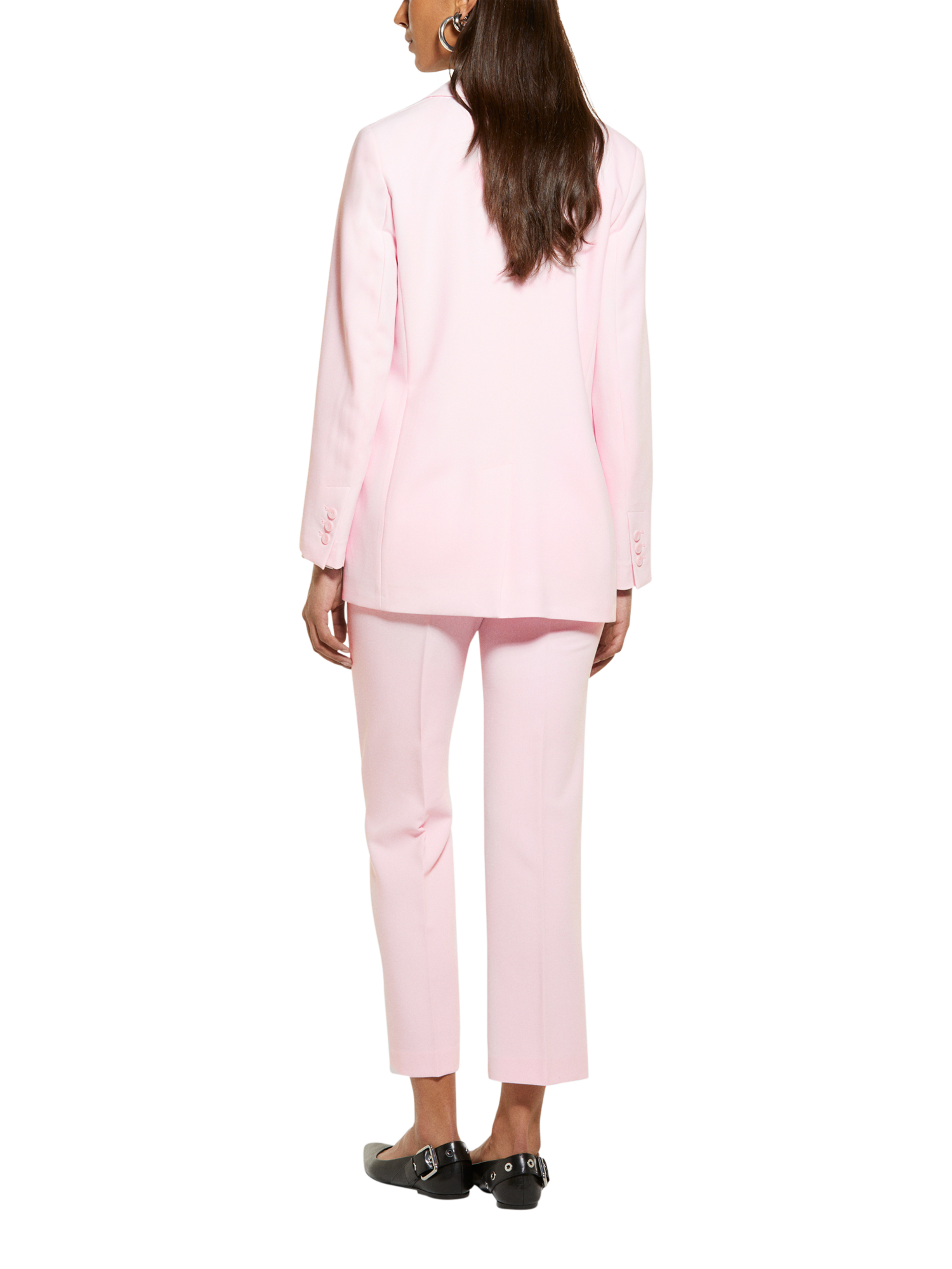 Elegant slim fit long blazer in a woven fabric. Features a single button fastening for versatile styling, complete with pleats and a back slit, ideal for workwear elegance.
