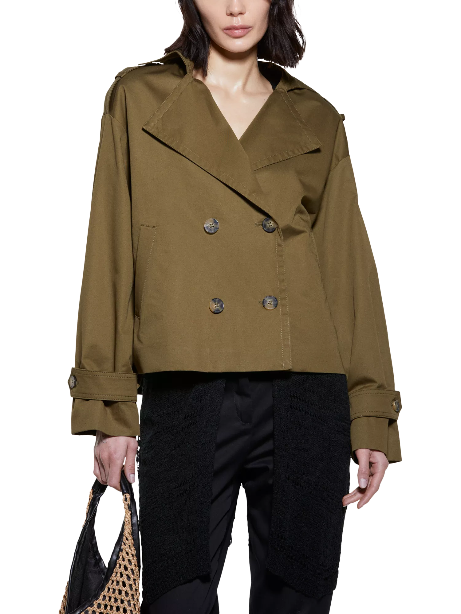 A clean-look short trench coat in cotton twill that's double-breasted with wide collar, lapels, and shoulder epaulettes. Plus, front welt pockets, long sleeves with belt, back slit with frog and button. Semi-lined with striped yarn-dyed lining. Thick stitching.