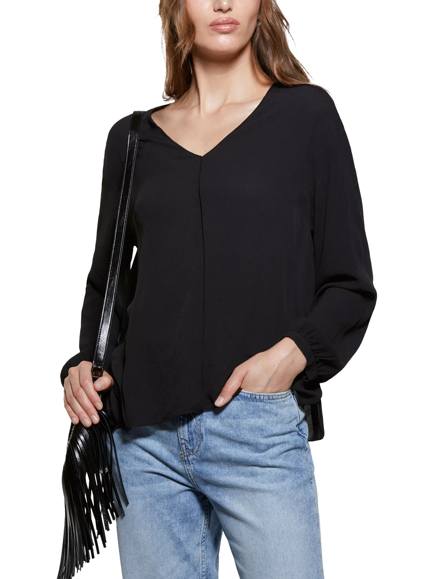This stylish oversized blouse features a chic V-neck and long sleeves, perfect for a relaxed yet sophisticated look. The viscose crepe fabric and sleek design create a timeless piece.