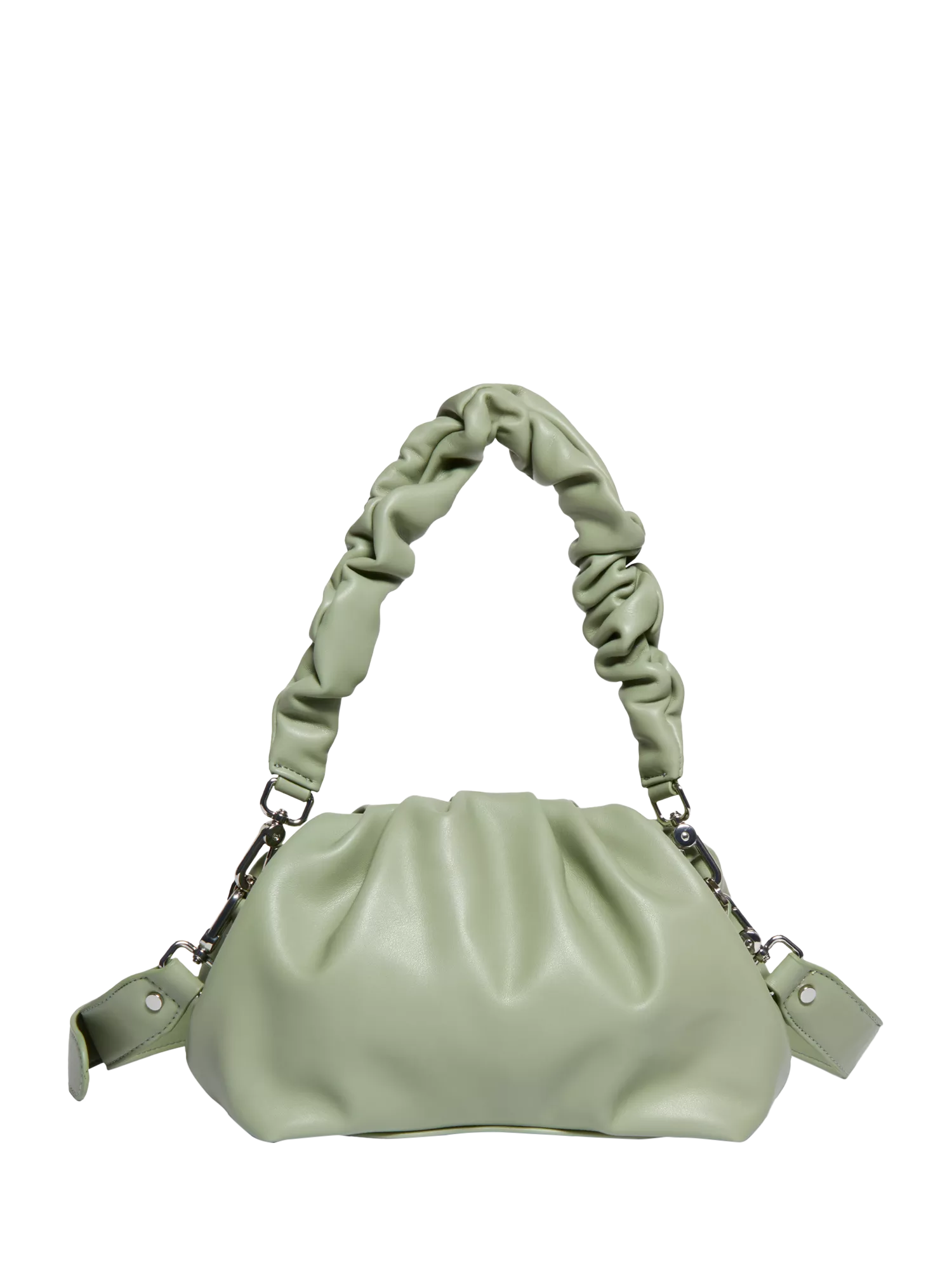 Clutch bag in imitation leather, with magnetic snap closure. Removable curled handle for shoulder carry and removable adjustable shoulder strap for crossbody carry.
