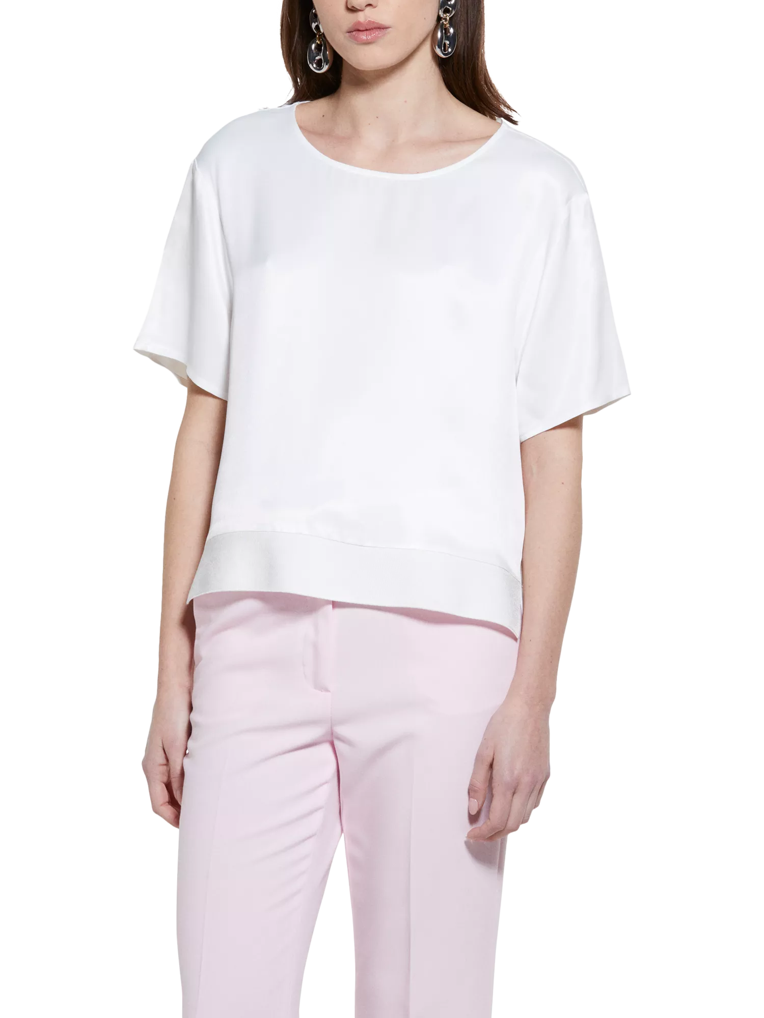 Blouse in viscose satin, with crepe insert on the front hem. Crew neck, keyhole opening closed by a small button on the back, short sleeves with soft shoulders and slits at the bottom.