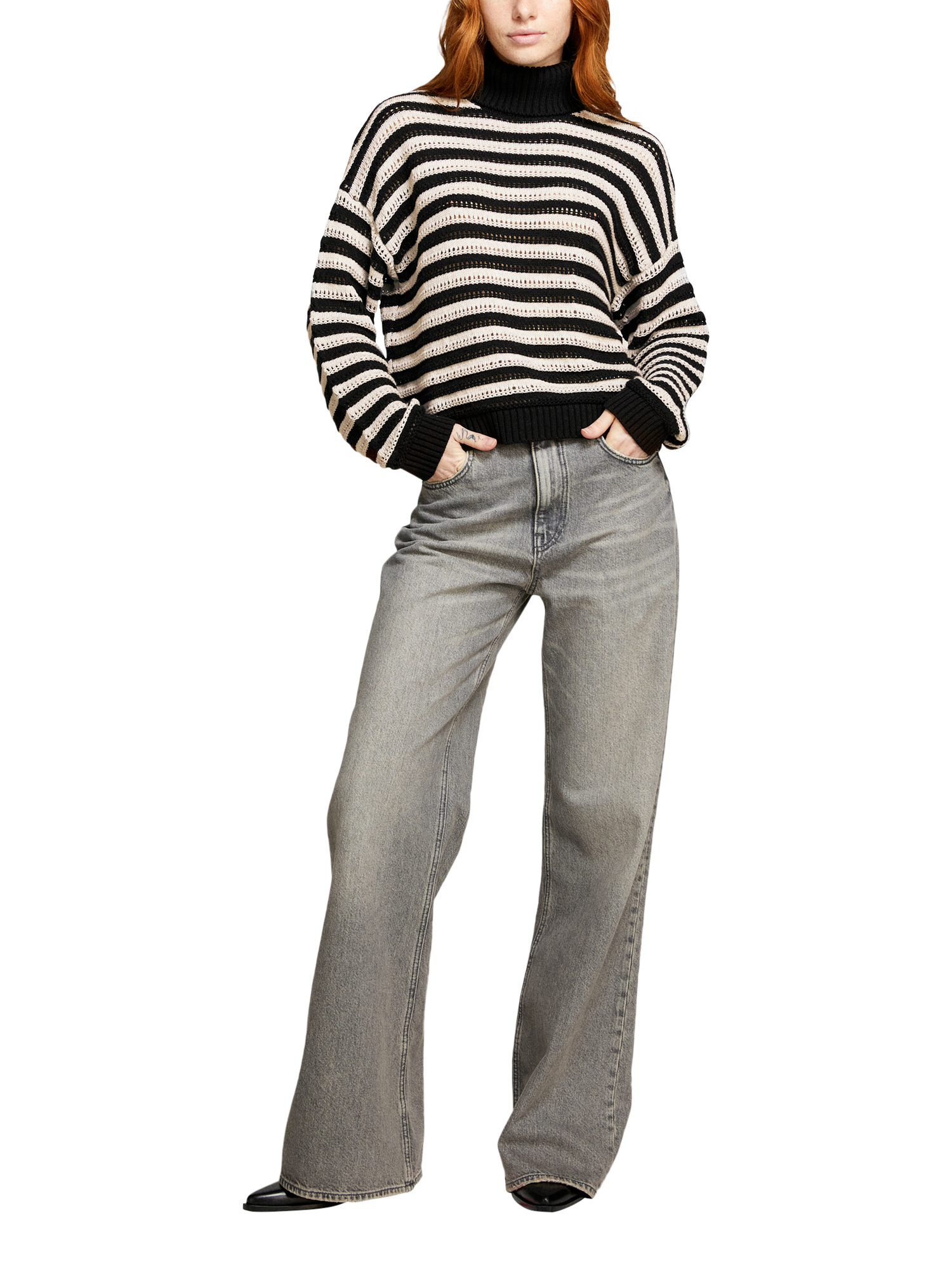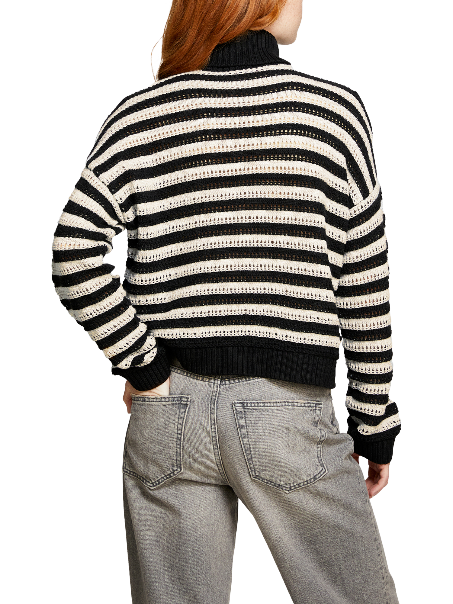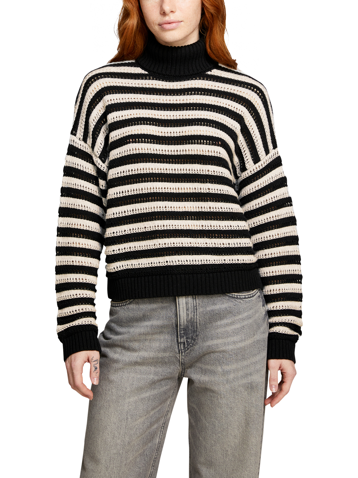 Sweater in soft cotton, viscose and wool blend fabric with textured two-tone striped knit. Maxi ribbed high collar, long sleeves and dropped shoulders.