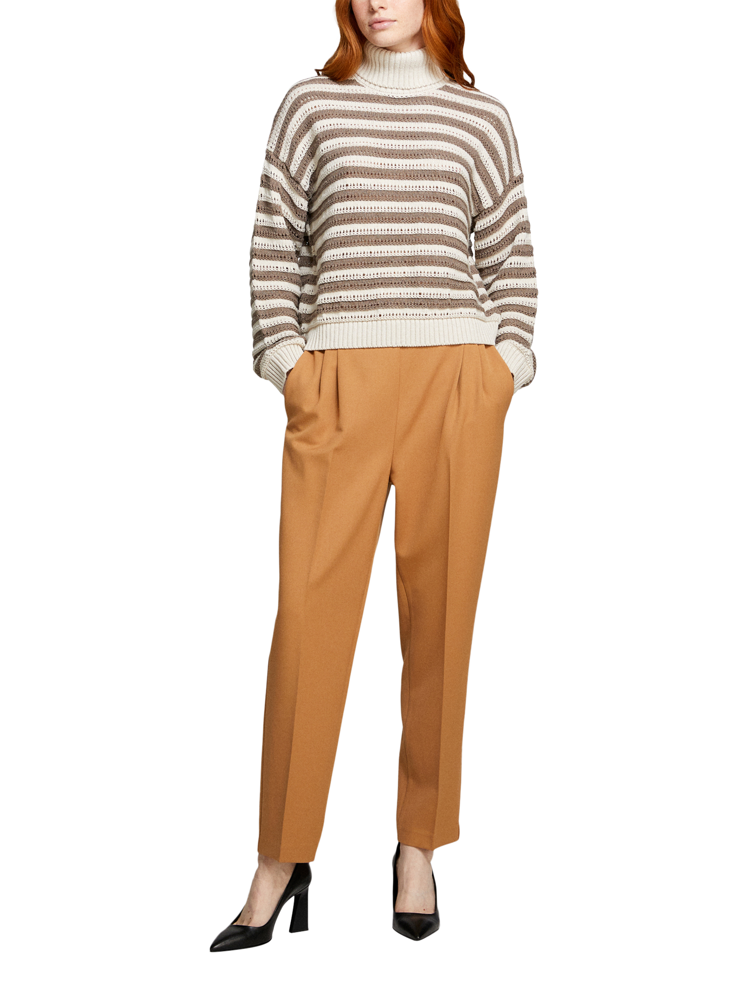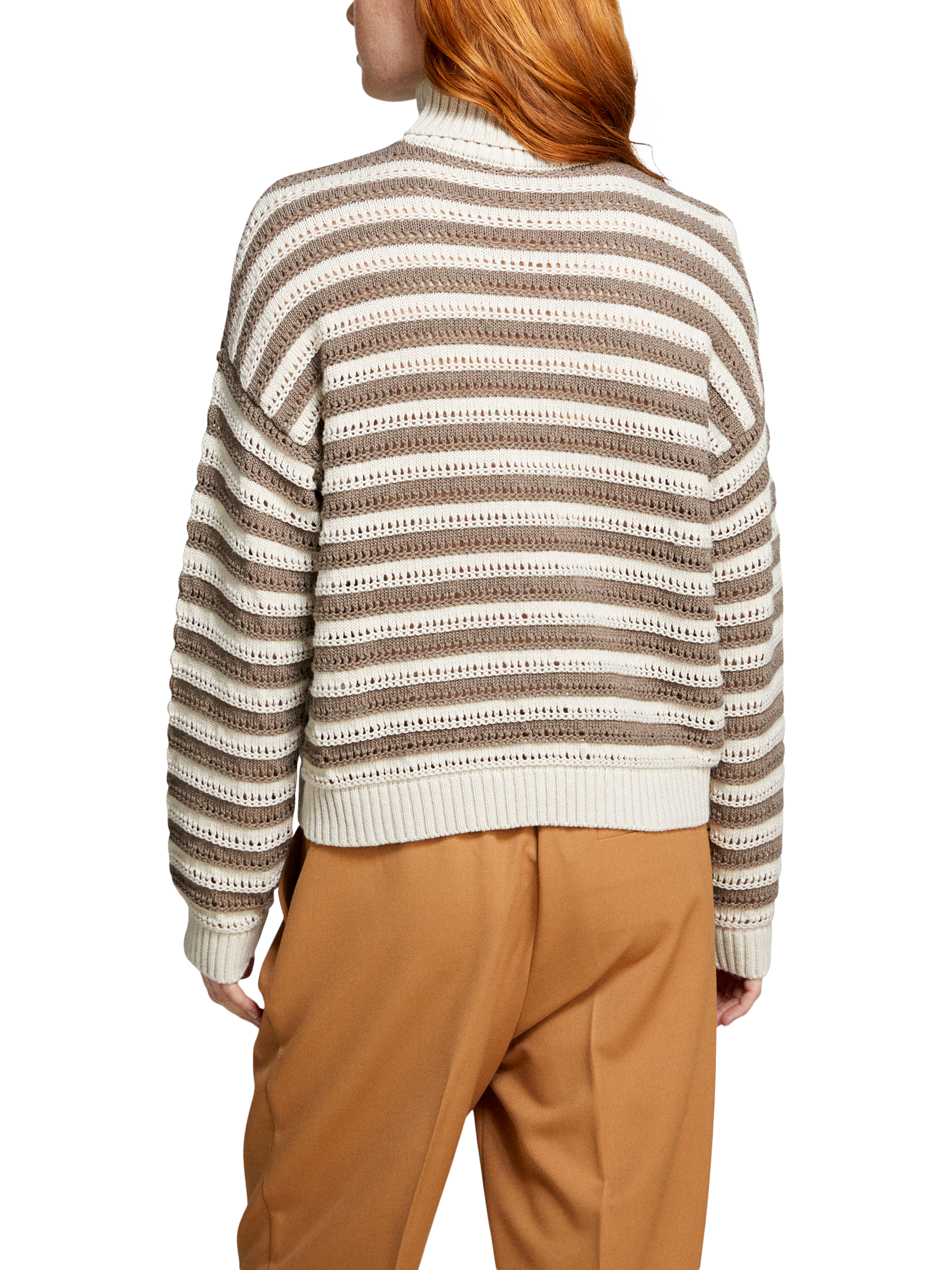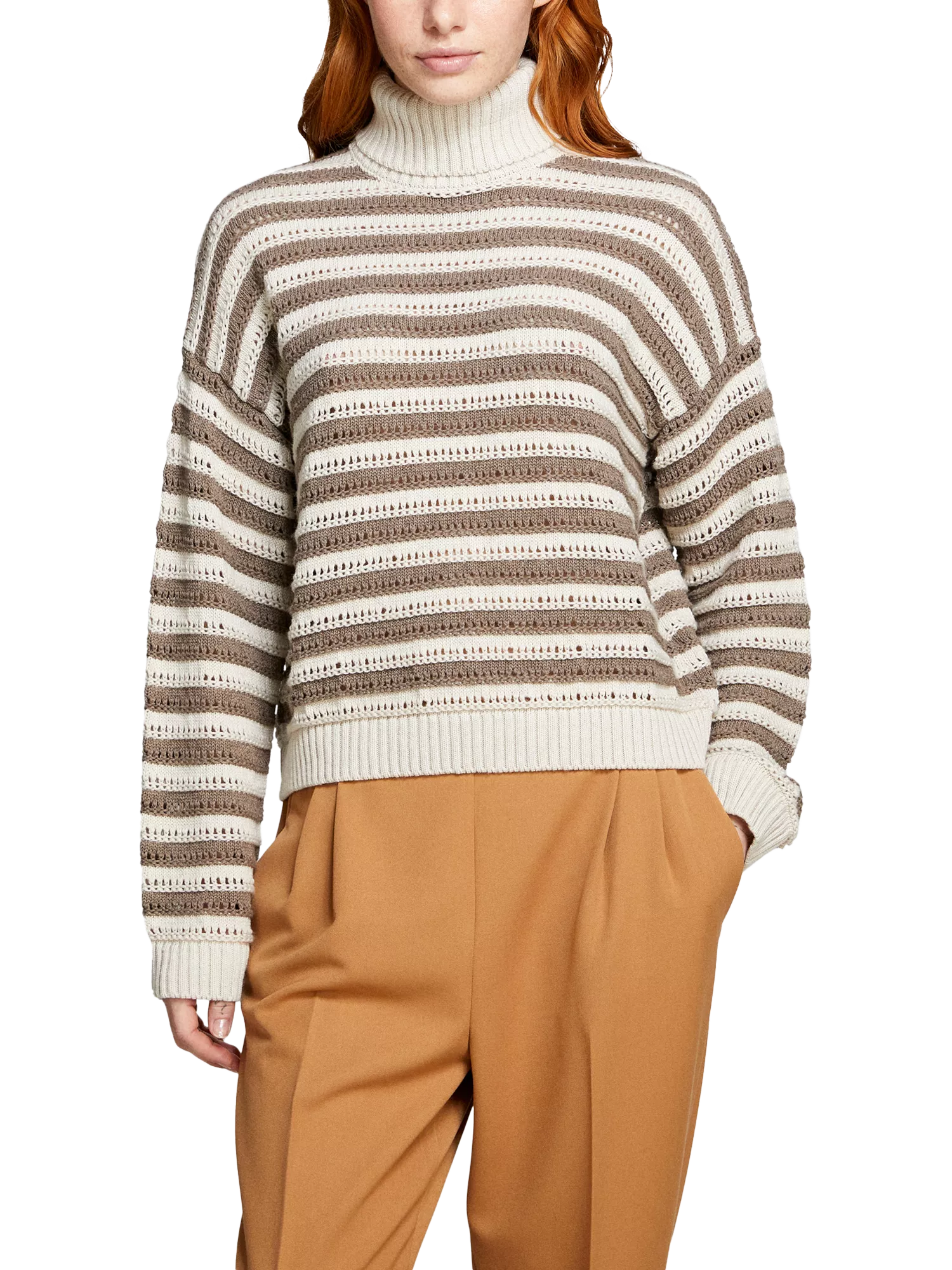 Sweater in soft cotton, viscose and wool blend fabric with textured two-tone striped knit. Maxi ribbed high collar, long sleeves and dropped shoulders.