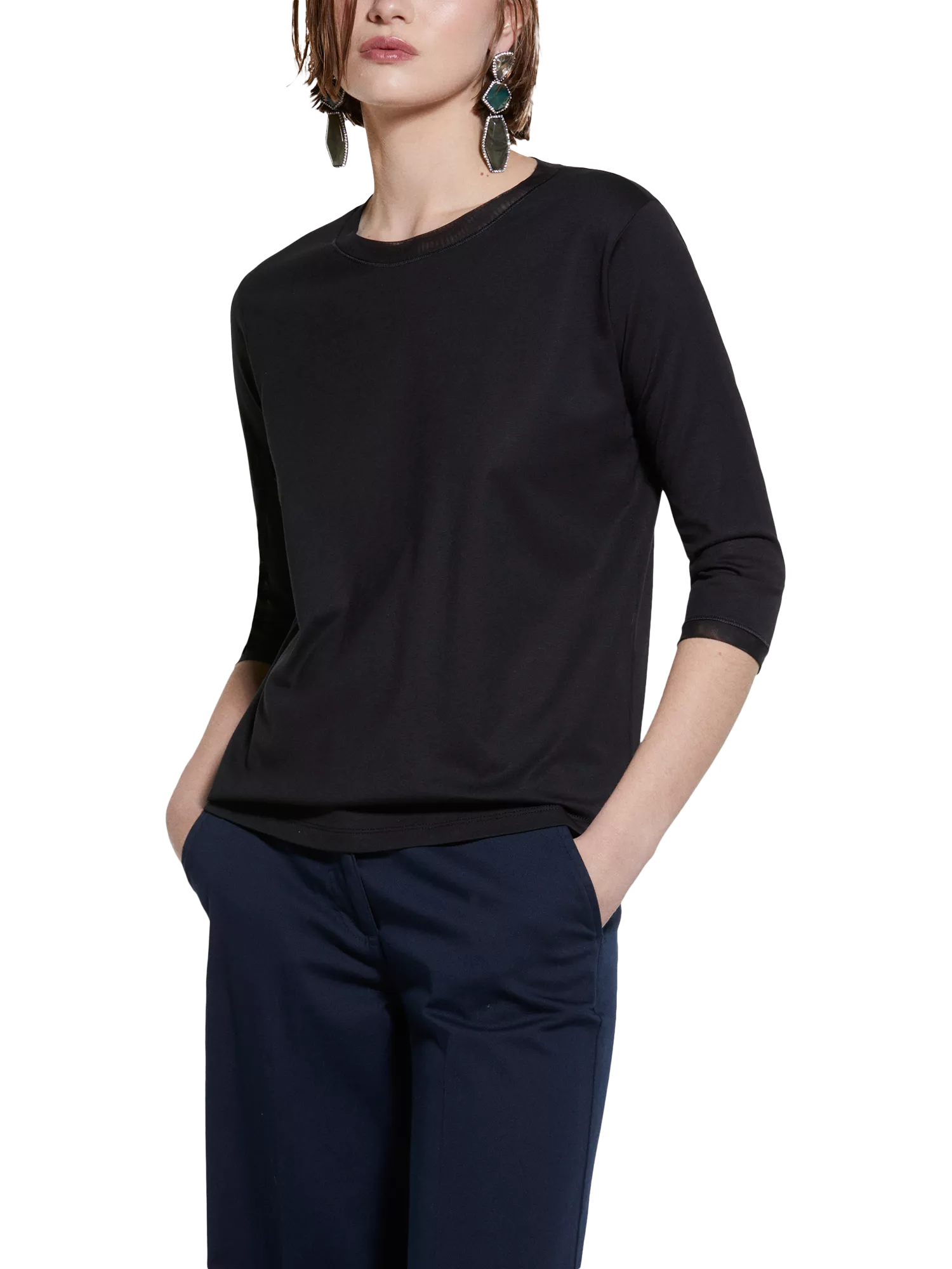 Detailed with tulle inserts, this jersey top by SISLEY is cut with a round neckline and three-quarter length sleeves, and is perfect for casual or chic occasions. Made with a soft cotton-modal blend, it complements any wardrobe.