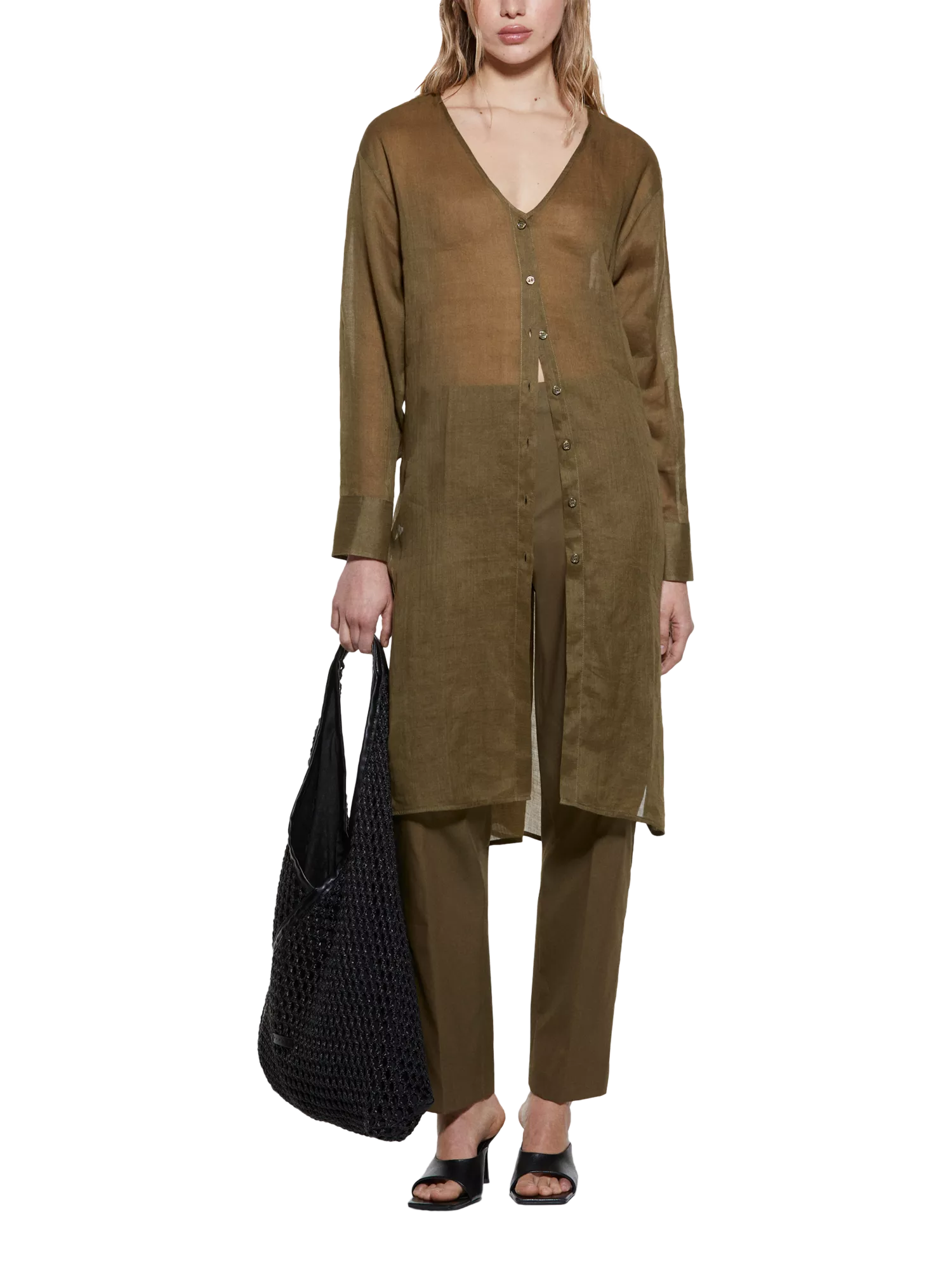 Elevate your warm-weather style with this sheer longline ramie shirt. A clever V-neck and button front keep it easy, while long sleeves offer versatility. Perfect for day outings, it pairs well with your favourite pieces for relaxed confidence.