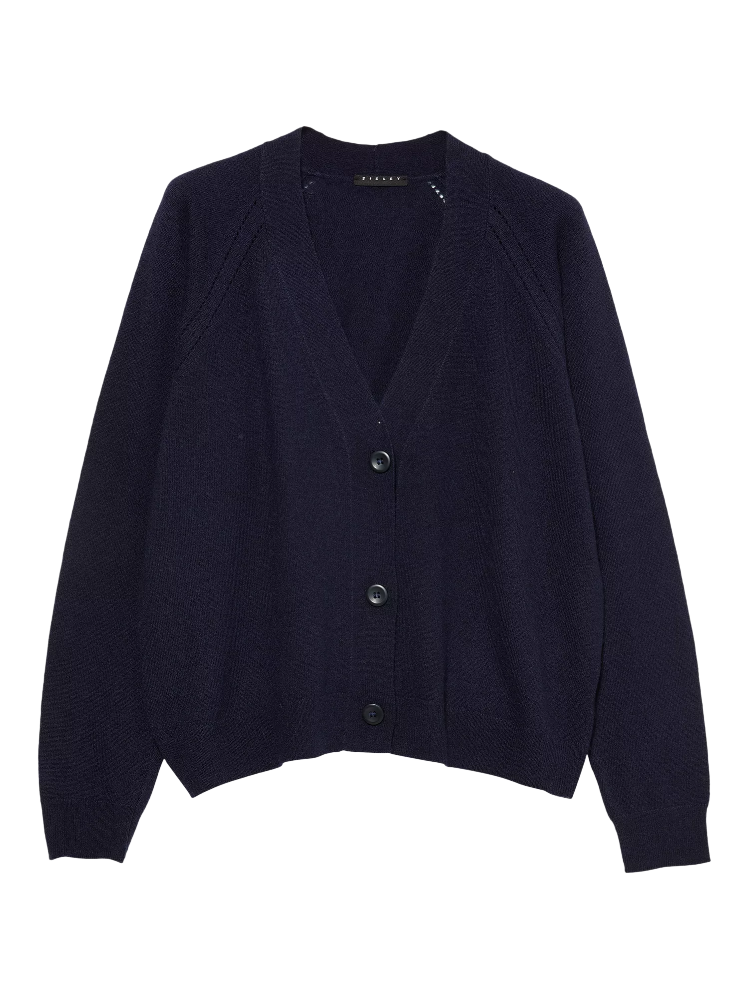 This oversized cardigan features a deep V-neck, long raglan sleeves with punch detail and three-button front opening.