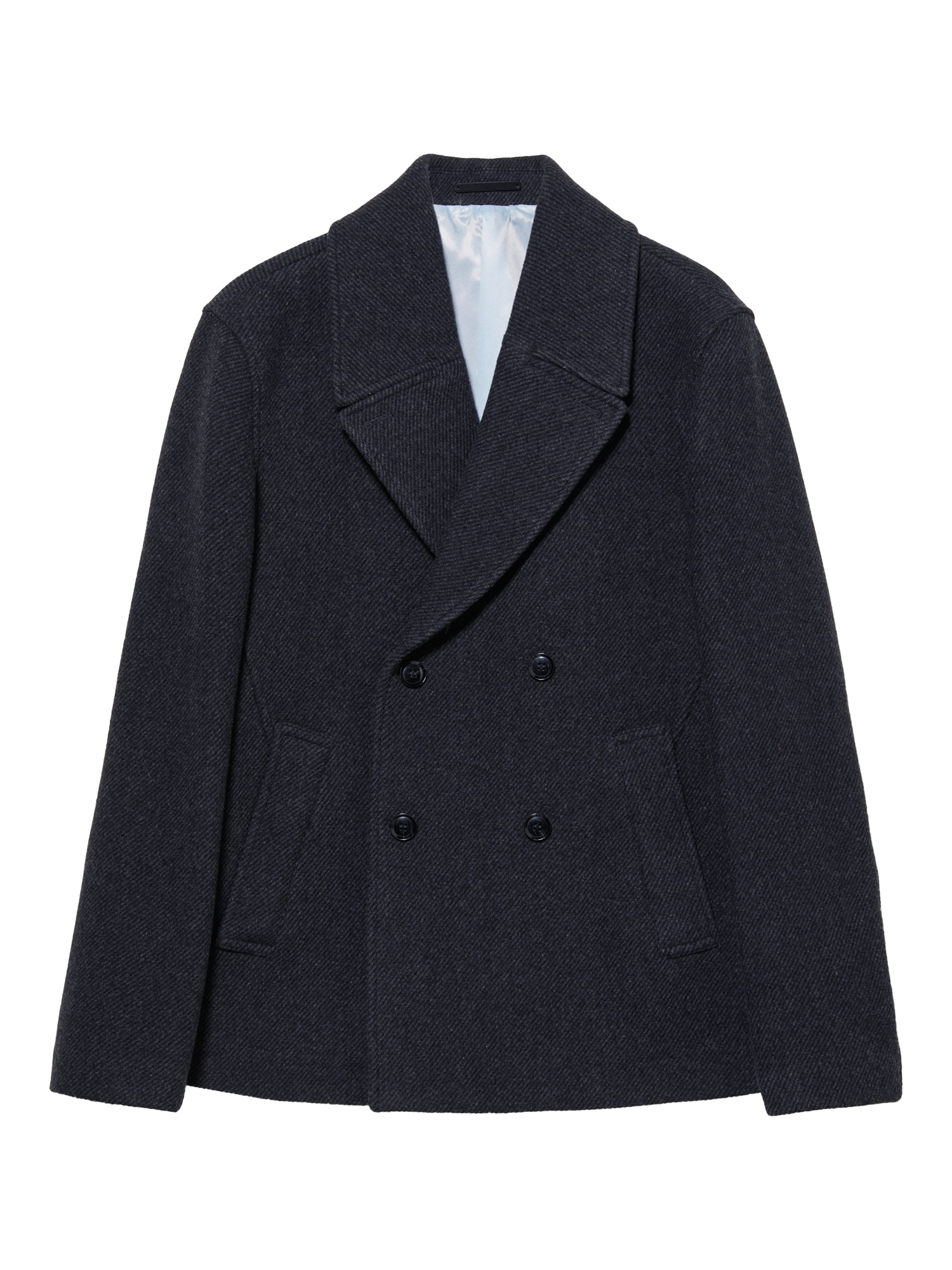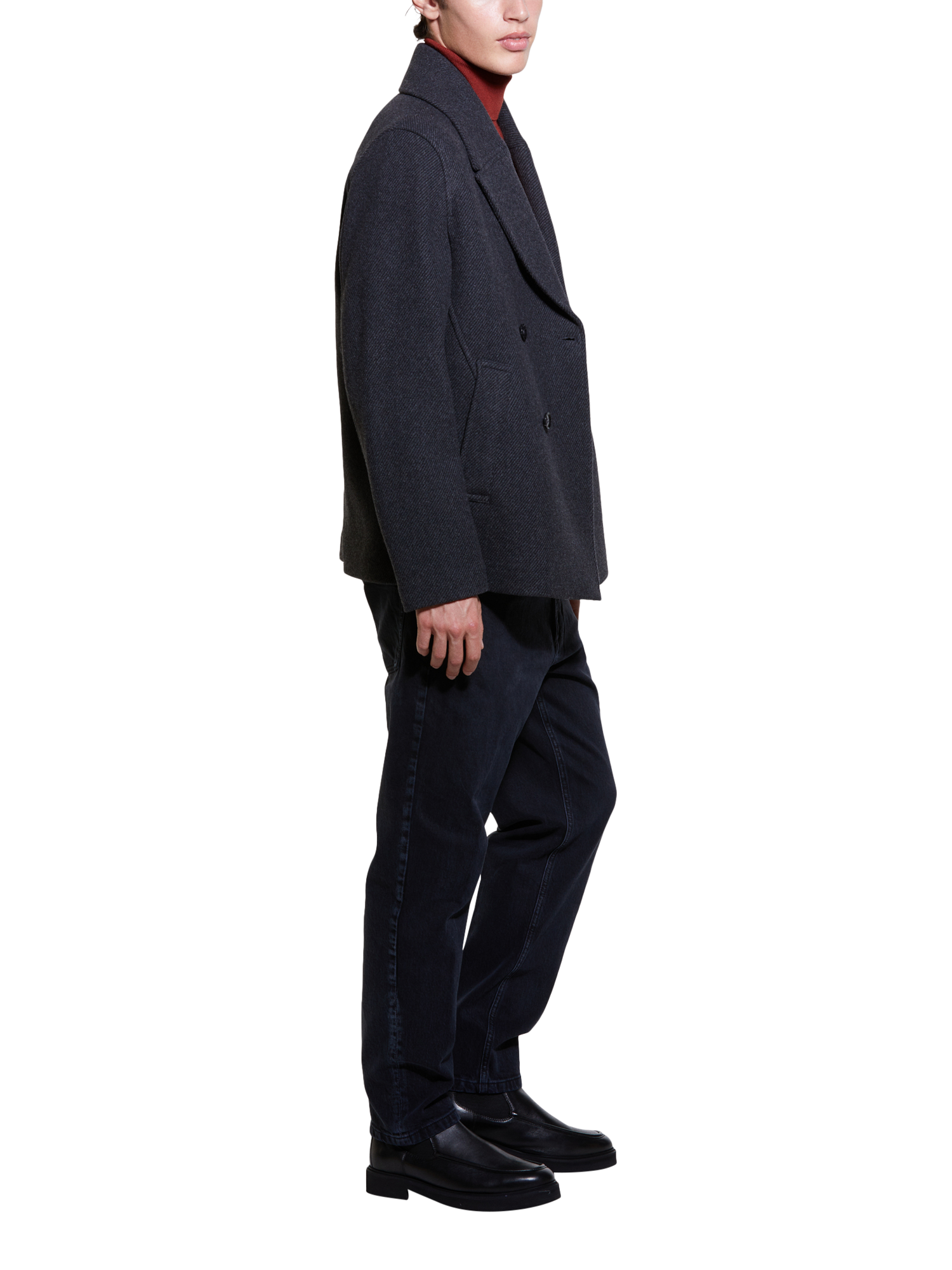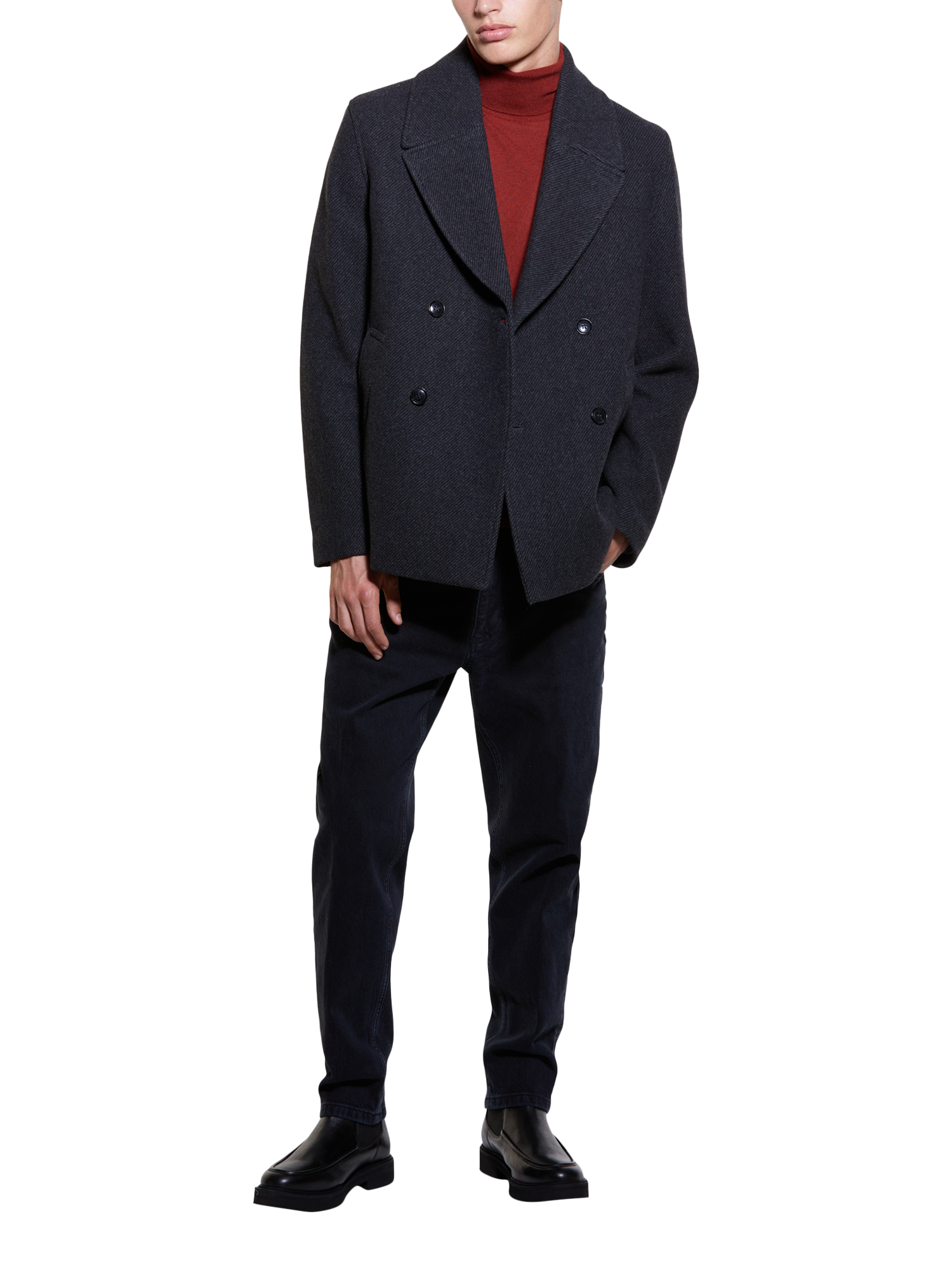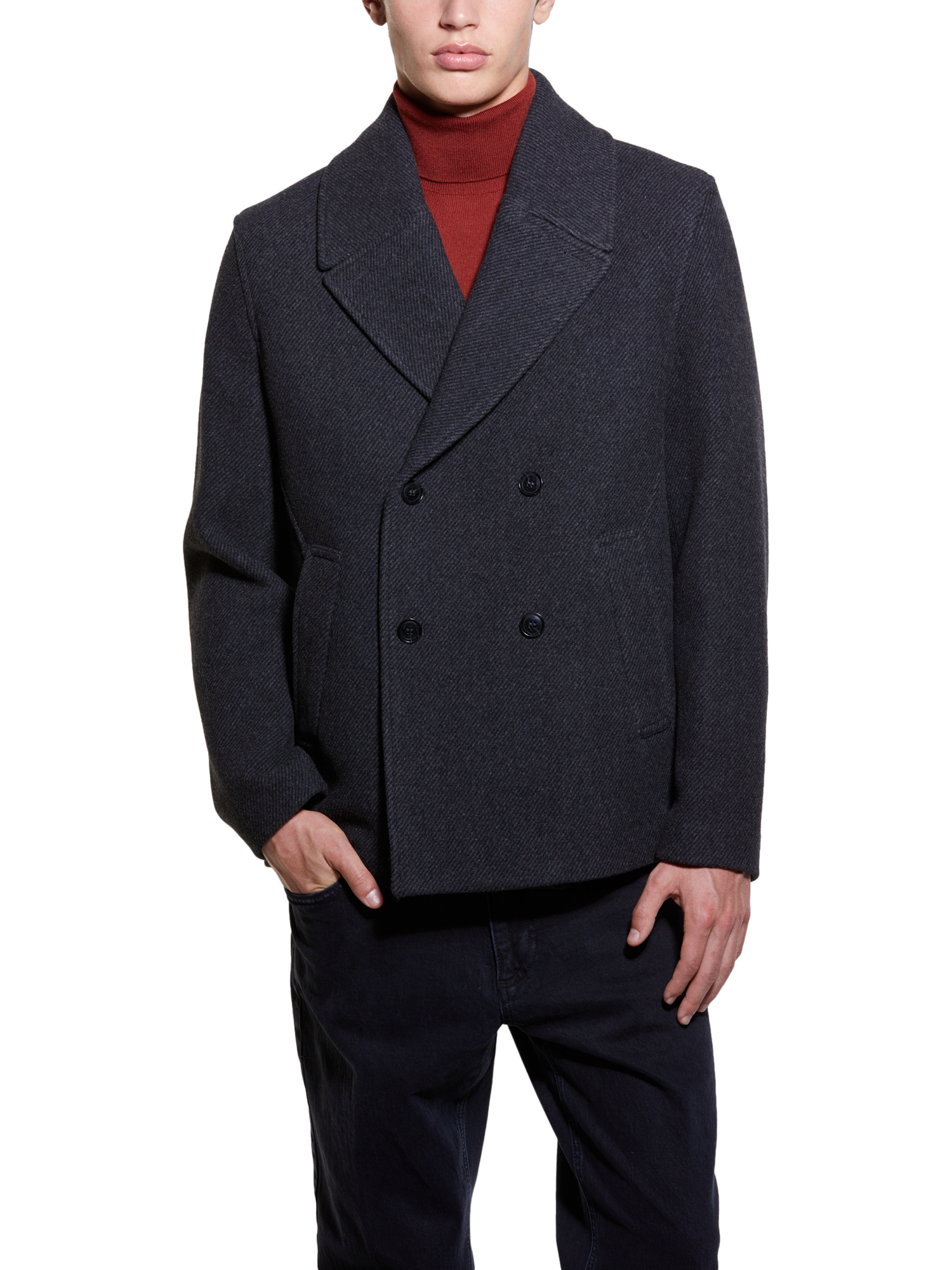 Dark grey peacoat jacket in soft wool blend fabric, with clashing color inner lining. Lapels, double-breasted closure and two welt pockets on the front.