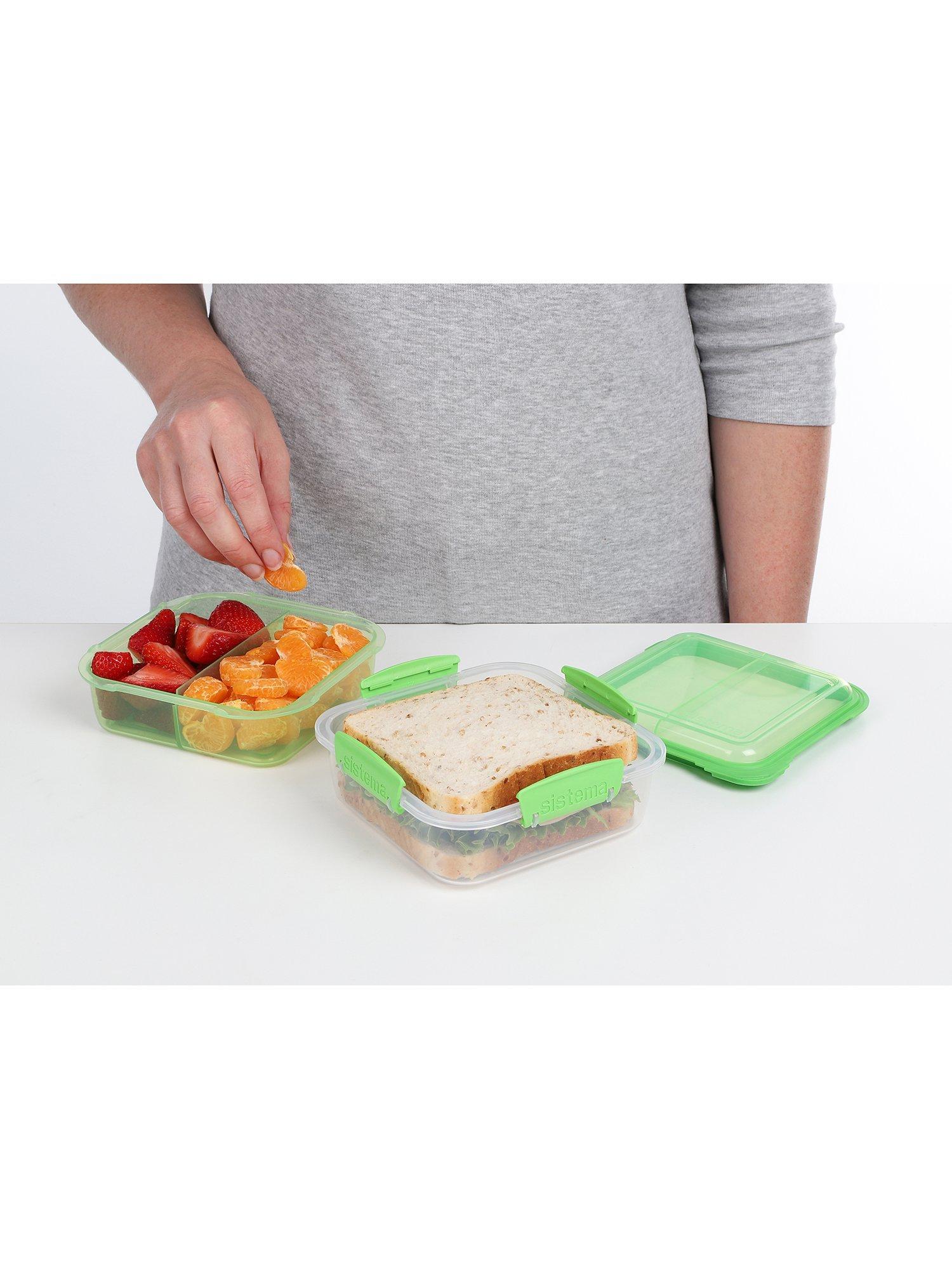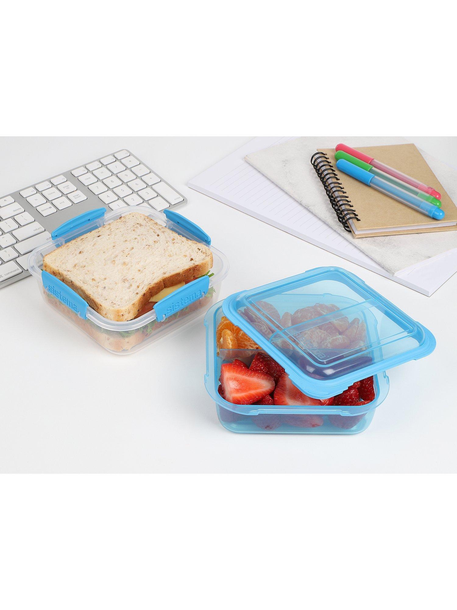 This lunch box from Sistema is ideal for keeping your food fresh until ready to eat. The divider tray in the lid separates fruit and salad from the larger sandwich section below. It closes with the brand's secure and easy clip-lock lid to seal in freshness.