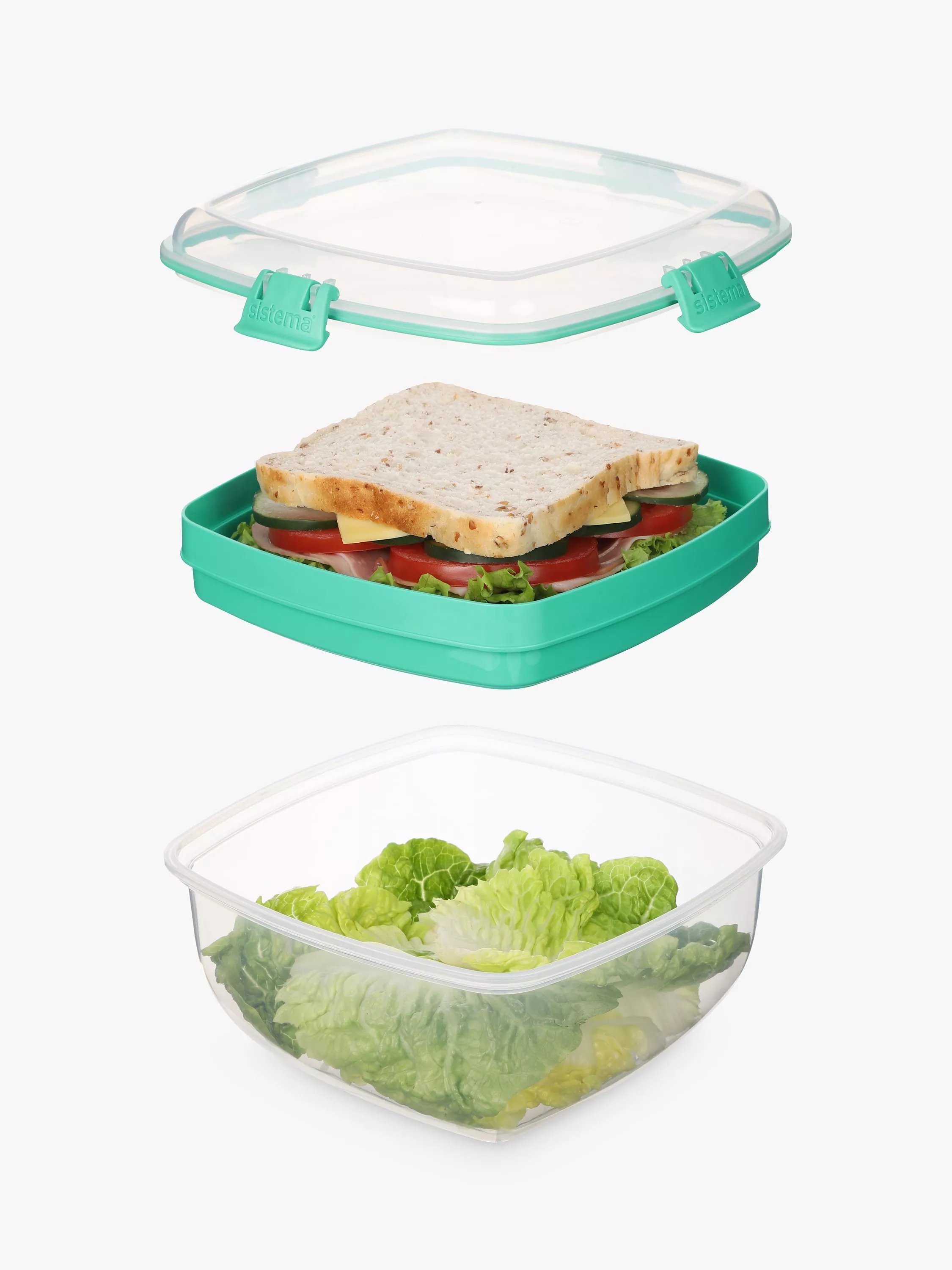 A Sistema® To-Go Salad & Sandwich box for keeping your food fresh until ready to eat. The divider separates your salad from your sandwich to keep the bread from getting soggy. The box closes with the brand's secure and easy clip-lock lid, made with a flexible seal to keep food fresh for longer.