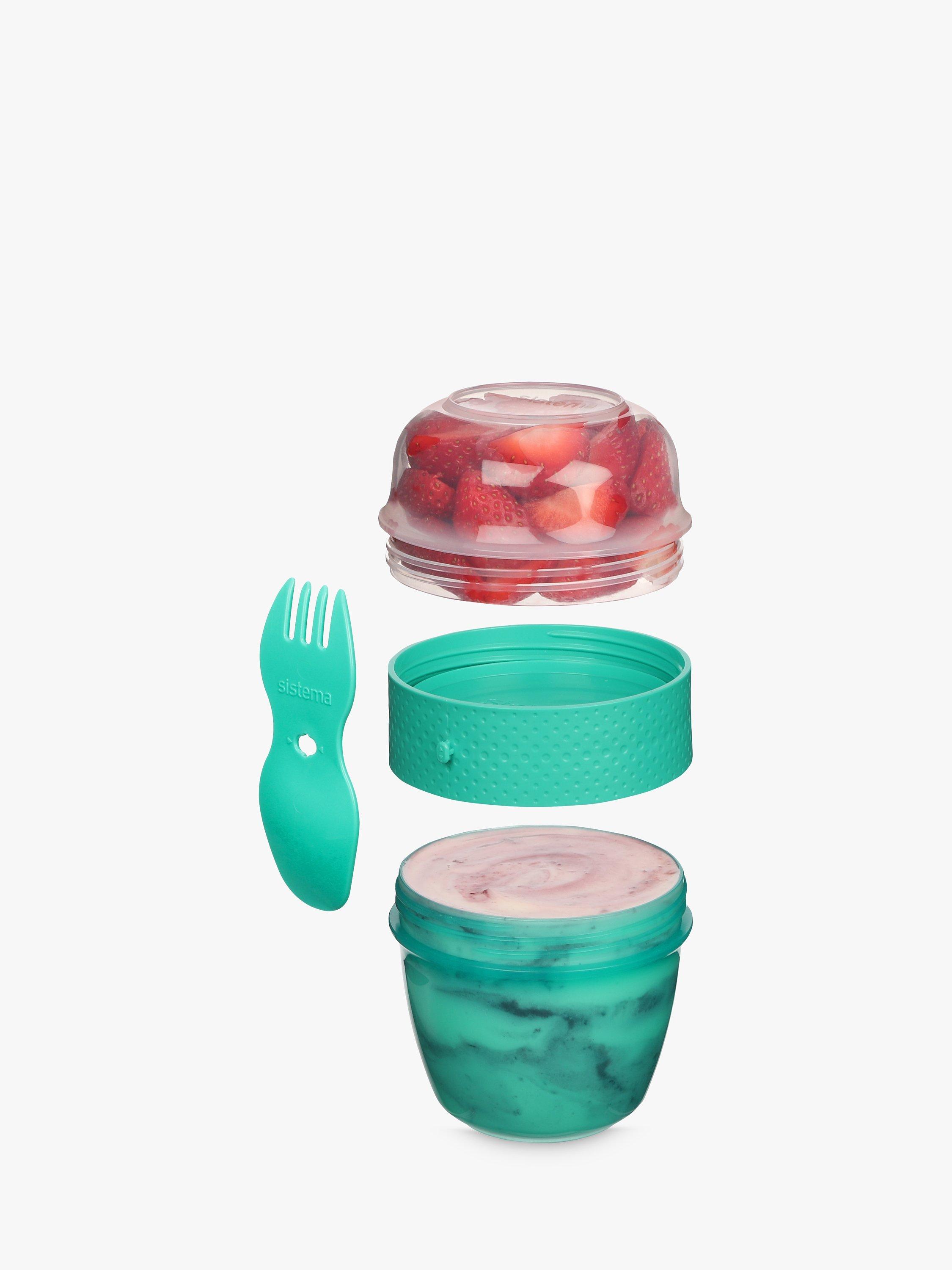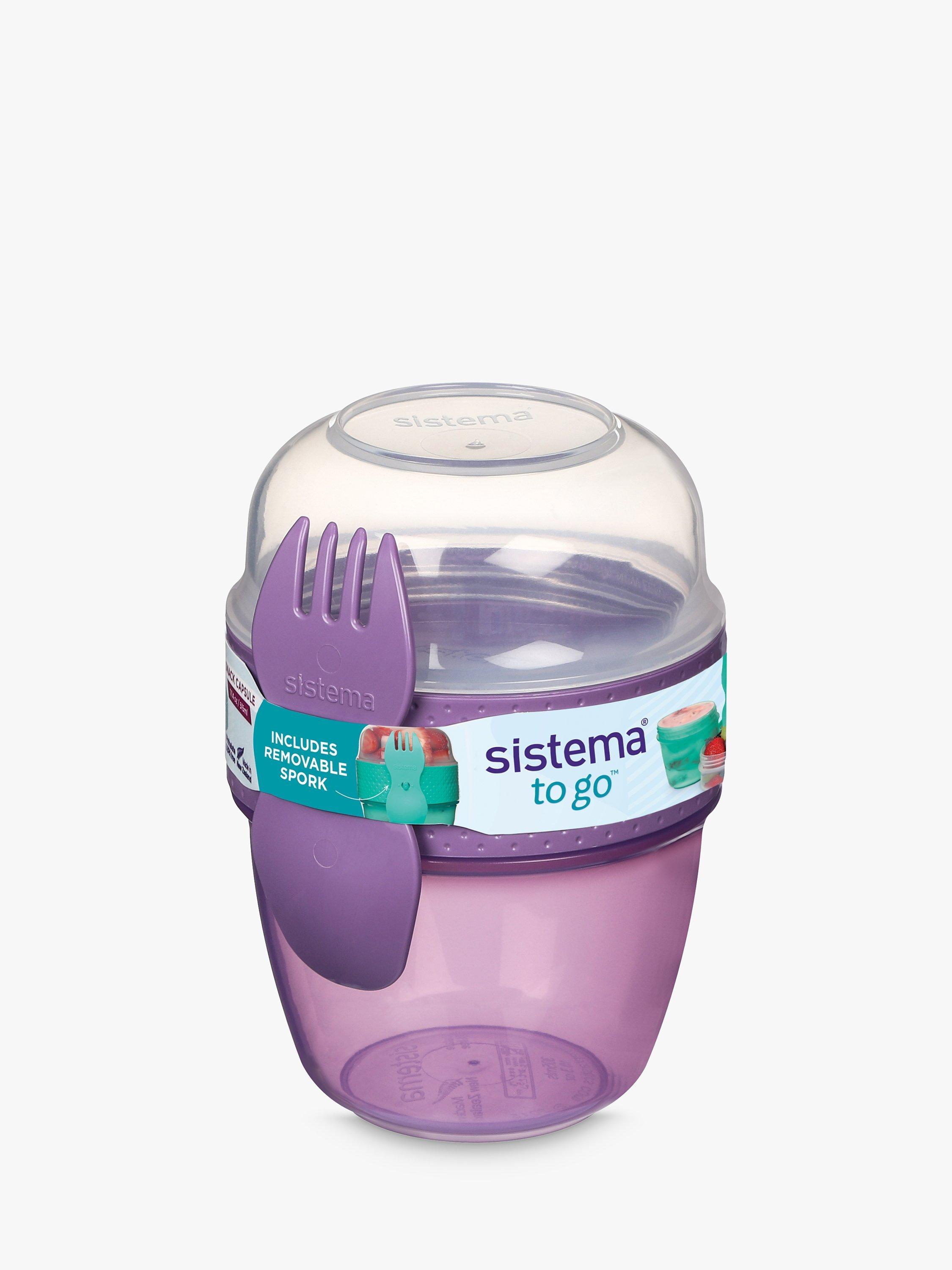 A Sistema® To-Go Snacks Capsule for keeping your food fresh until ready to eat, with a screw-top lid. The two compartments keep food separate and the spork (spoon/fork) clips into the lid as handy cutlery.