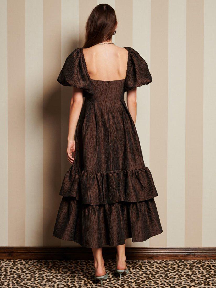 Midi-length dress in a textured taffeta fabric. Fully lined with boned structured cups. Detailed with a full skirt with waist pleats and a double hem ruffle.