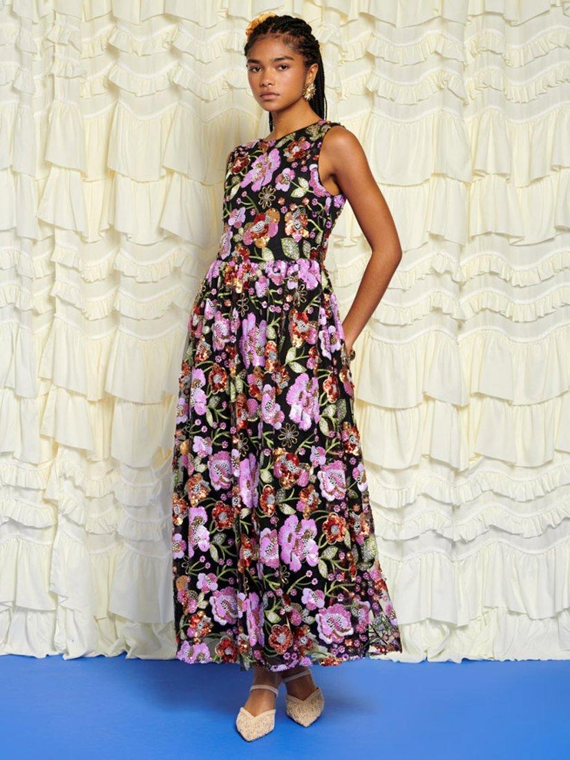 Maxi length dress in a soft tulle fabric, densely embroidered with sequins and beading in a floral pattern. Fully lined and finished as a sleeveless style with a low scooping back and a thin band along the shoulders.