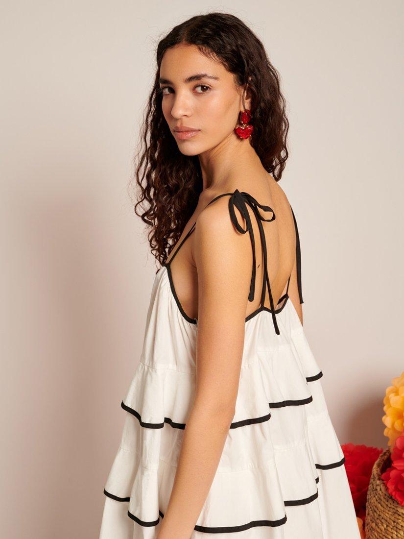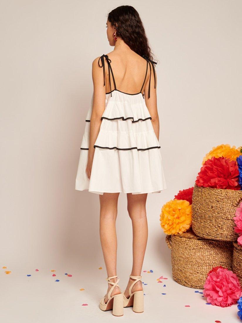Mini length dress in a lightweight woven fabric. Detailed with flounce ruffles with a contrast binding and adjustable strap ties. Fastened with a concealed side zip.