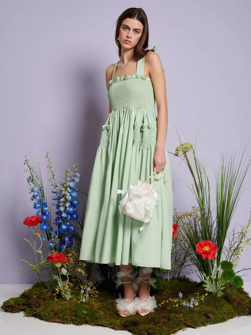 Midi-length dress in a structured woven fabric. Detailed with a shirred bodice and a shirred ruffle overskirt panel. Finished with adjustable bow-tie straps.