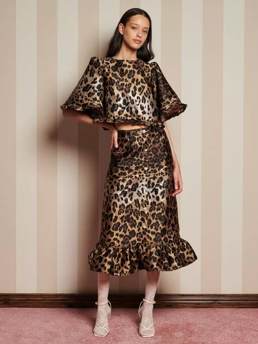 Midi length skirt in a leopard jacquard fabric with metallic detailing. A high-waisted fit featuring decorative pearl and gem buttons.