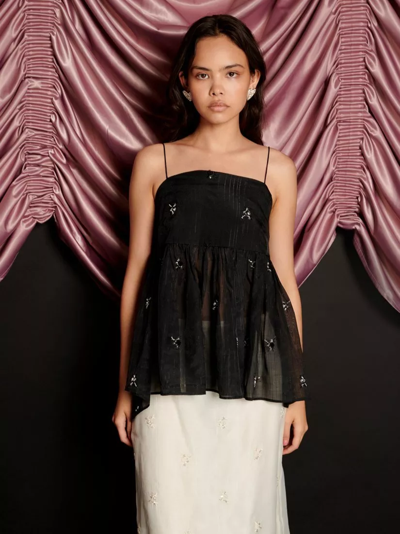 Cami top in a bead-embellished organza fabric. Detailed with a gathered peplum and a decorative bow at the back.