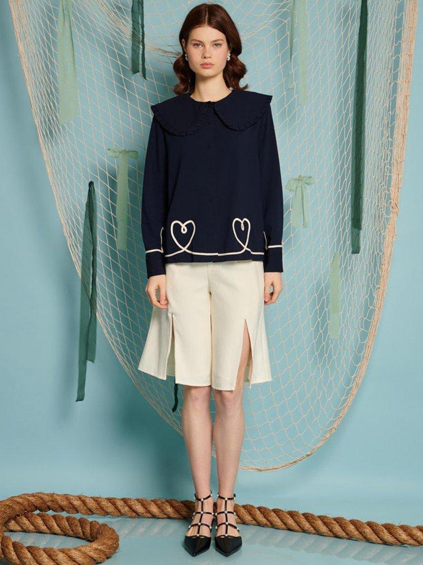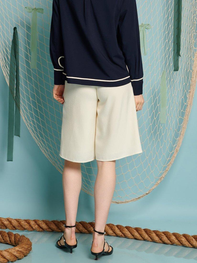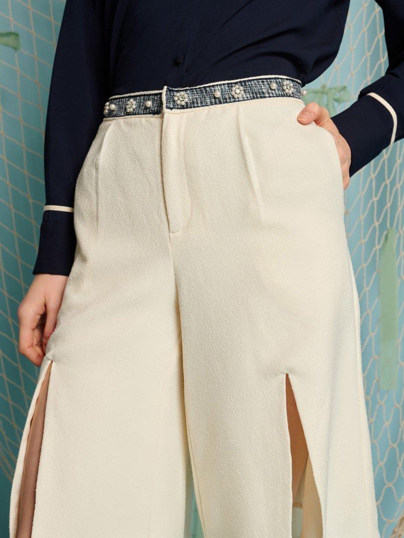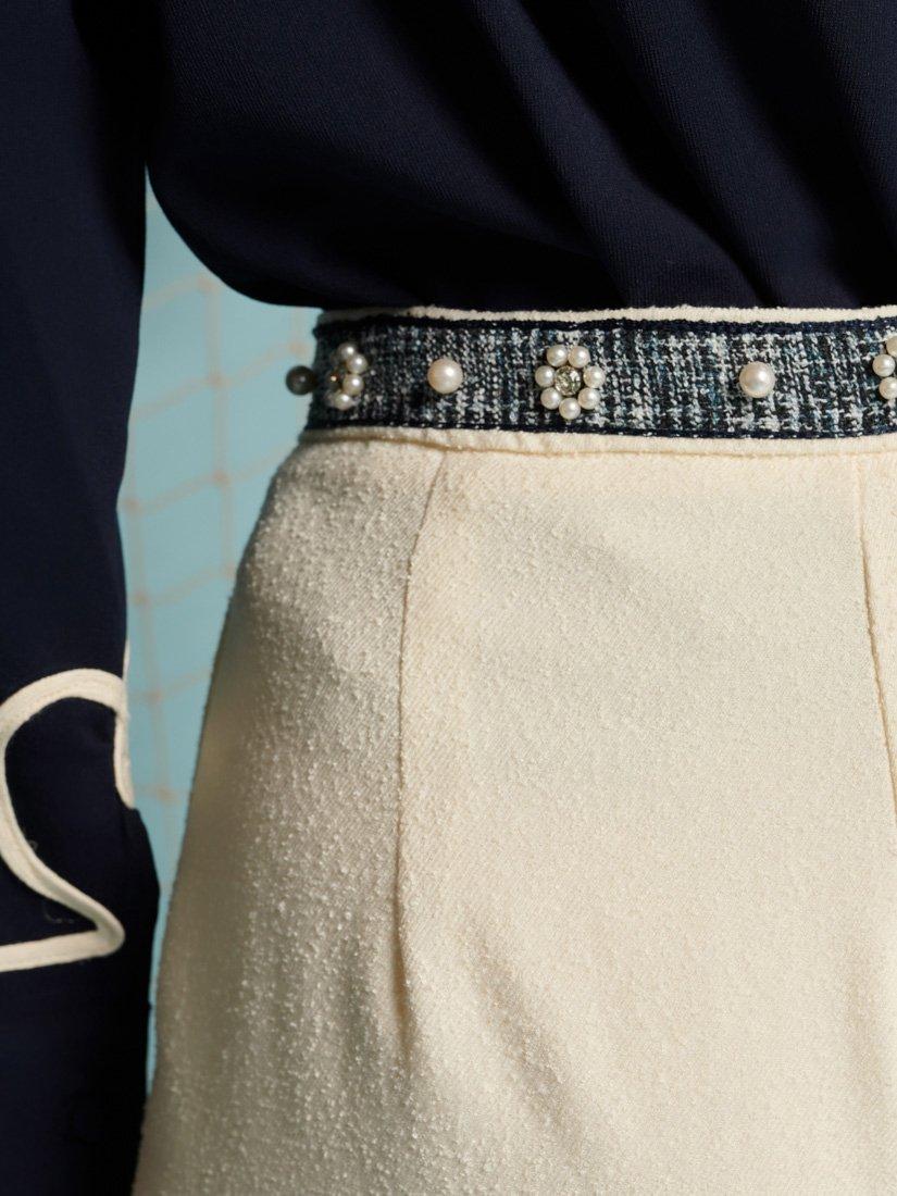 Bermuda shorts in a soft boucle fabric. A fully lined style with exaggerated splits at each front leg. Detailed with a contrast tweed trim embellished with gems and pearls. Fastened with a zip and fly with a concealed hook.