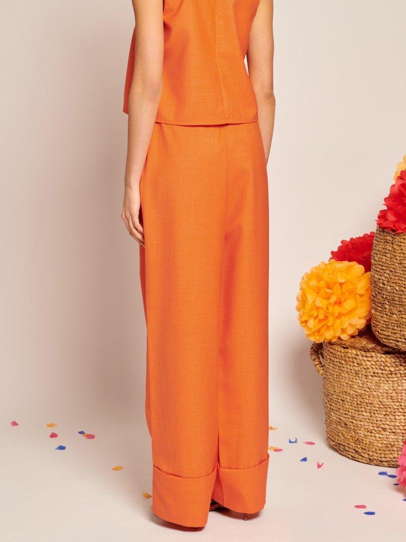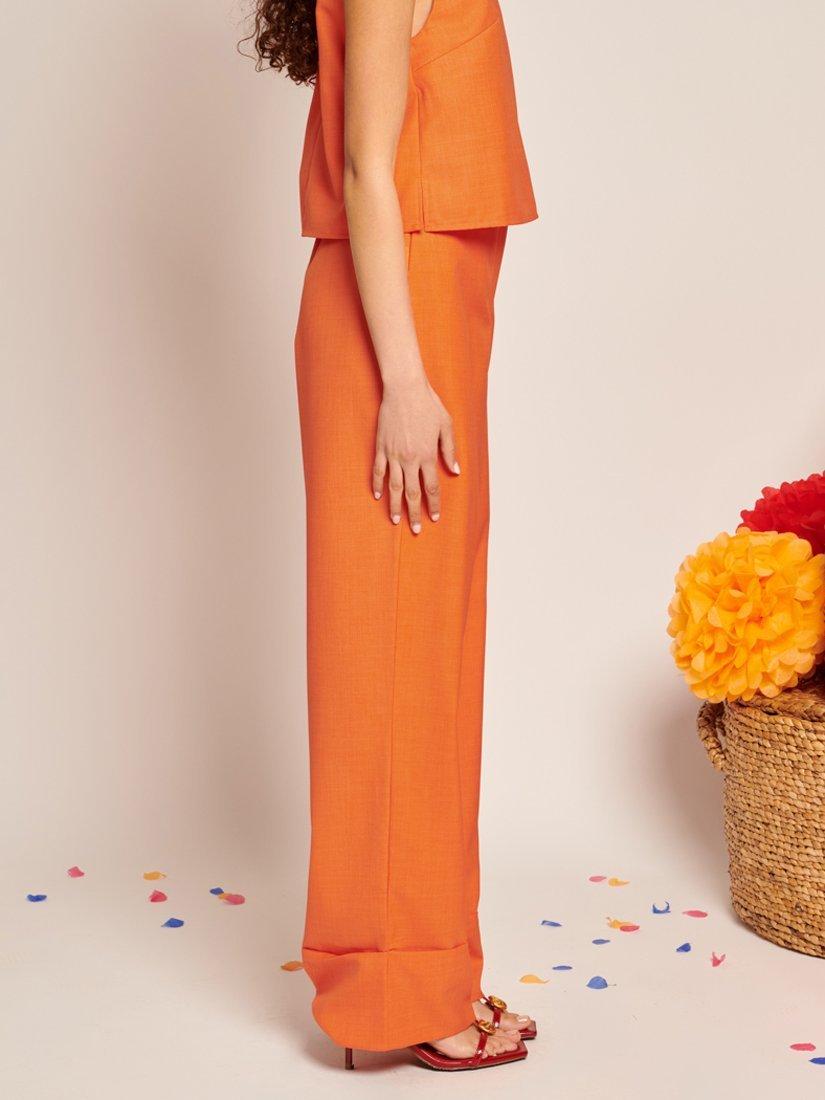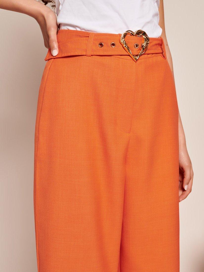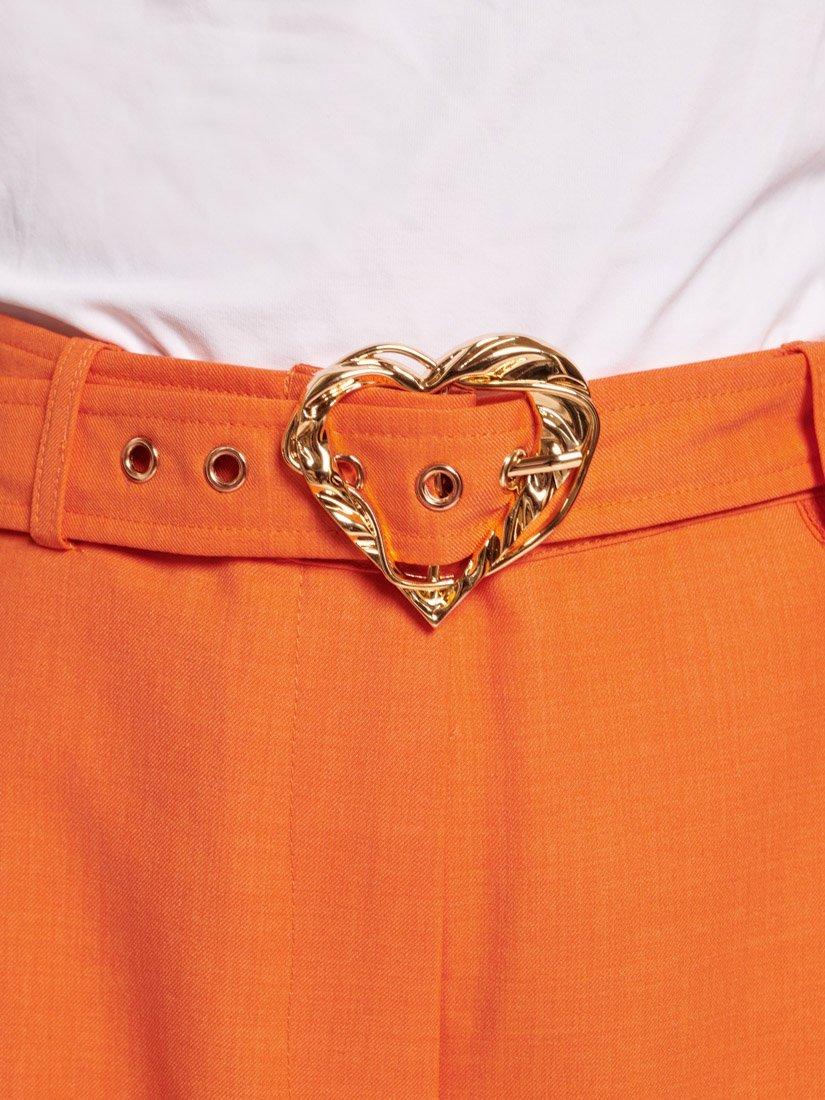 High-waisted trousers in a light woven fabric. Featuring belt loops and a belt in matching fabric with a golden heart buckle. Detailed with deep turn-ups. Finished with concealed side seam pockets and a pair of back welt pockets. Fastens with a concealed zip at the side seam.