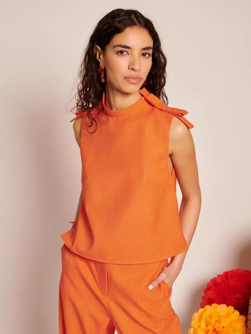 Cropped length sleeveless top in a light woven fabric. Detailed with fixed bows on the shoulder and fastened with a concealed zip.