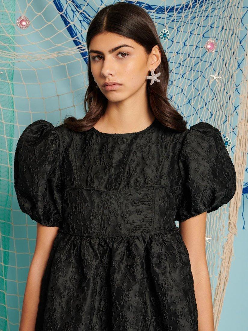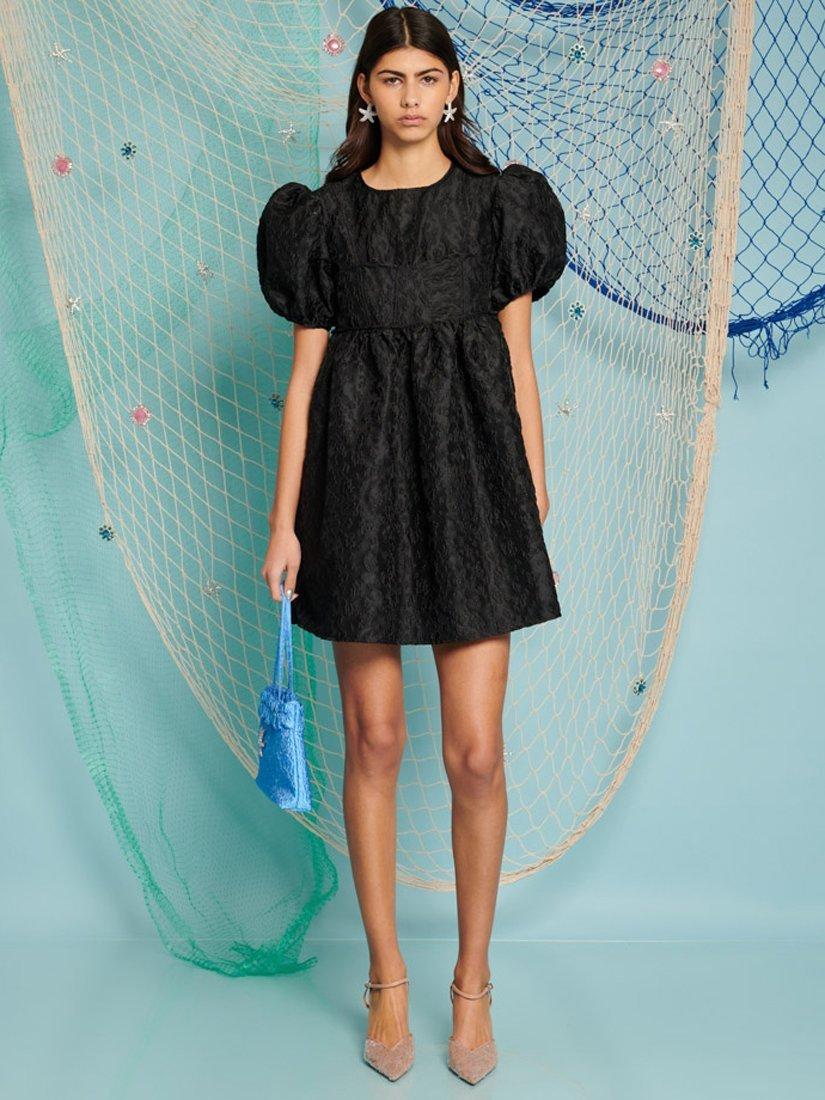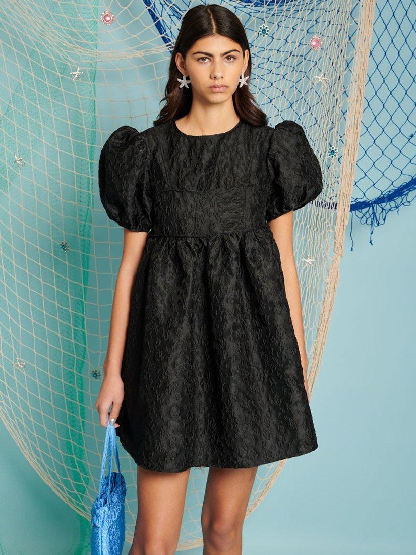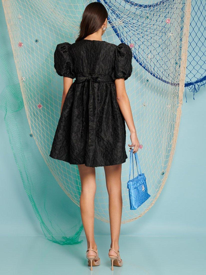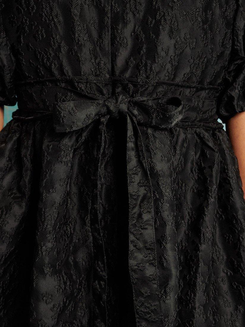 Mini-length dress in a floral jacquard fabric. Detailed with a panelled bodice with bound finish and an adjustable bow at the back.