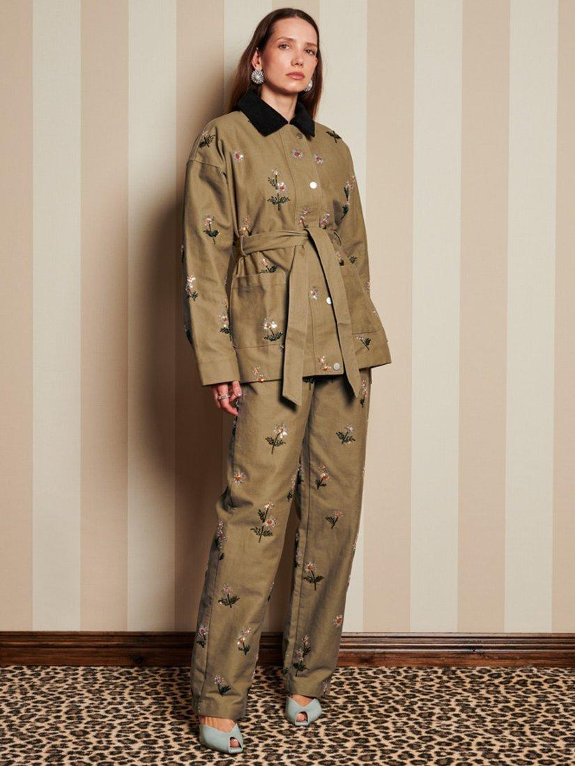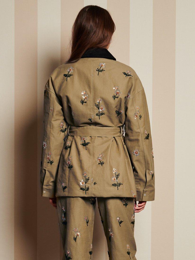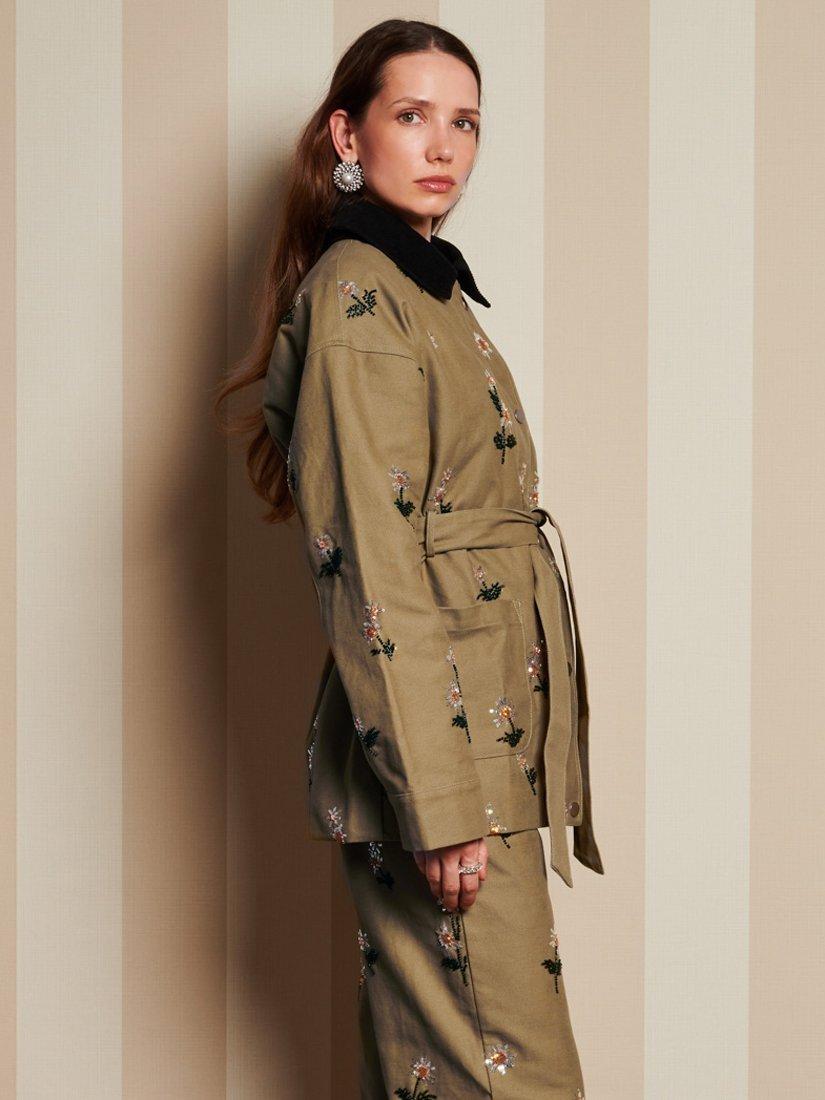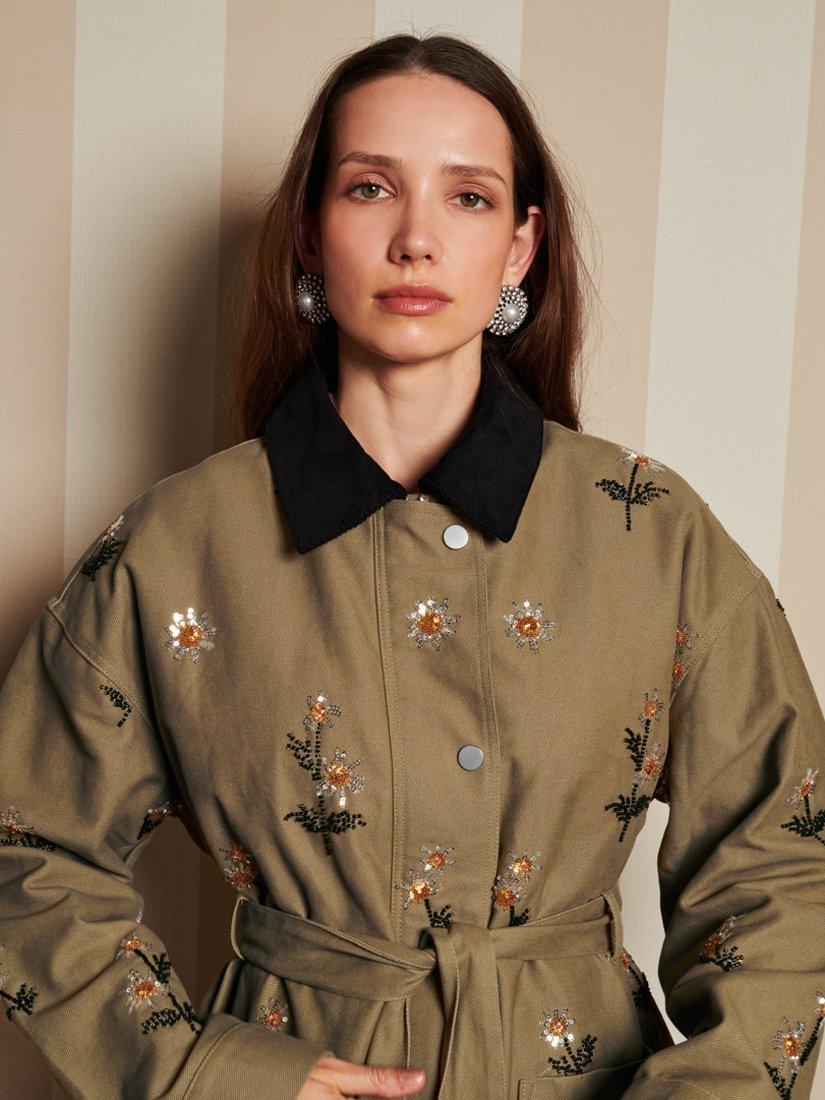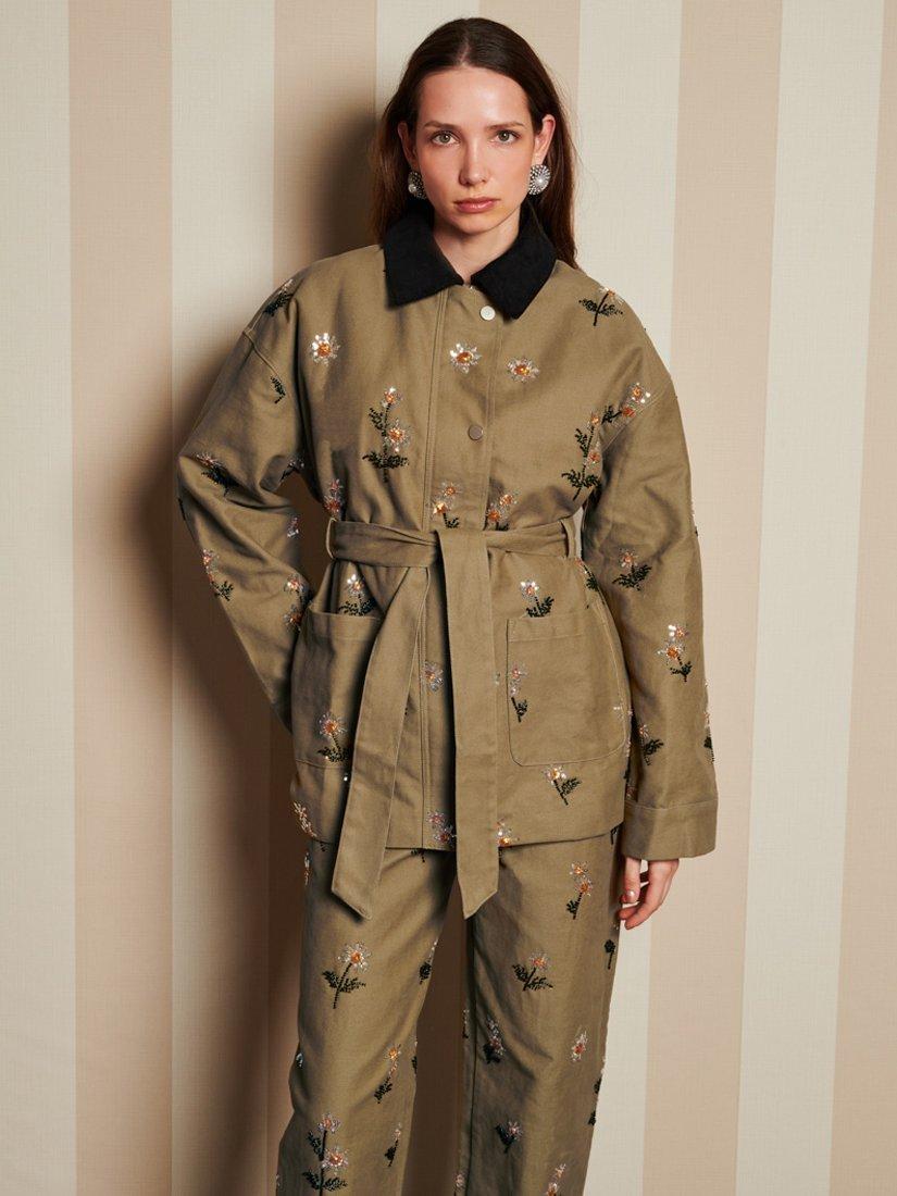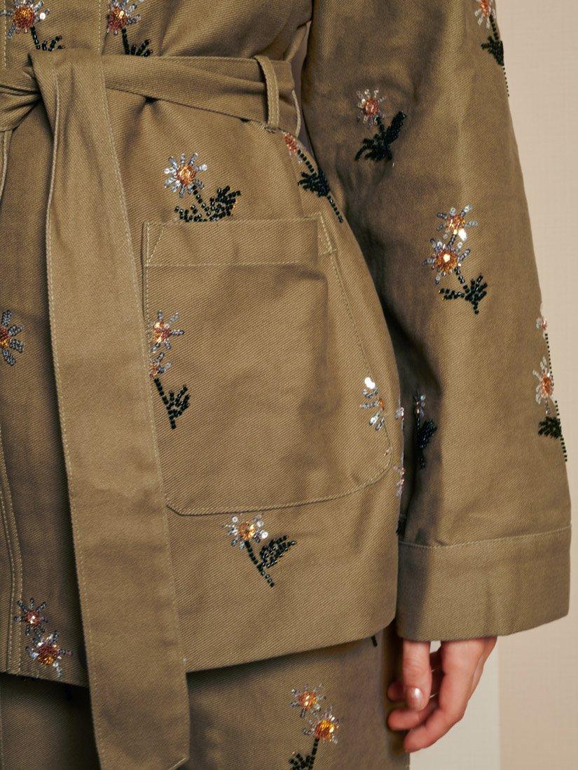Relaxed fit jacket in a woven drill fabric with all-over sequin daisy embellishments. Fully lined with a contrast cord collar. Detailed with front patch pockets and a removable waist belt in matching fabric. Fastened with a concealed zip and silver press studs.