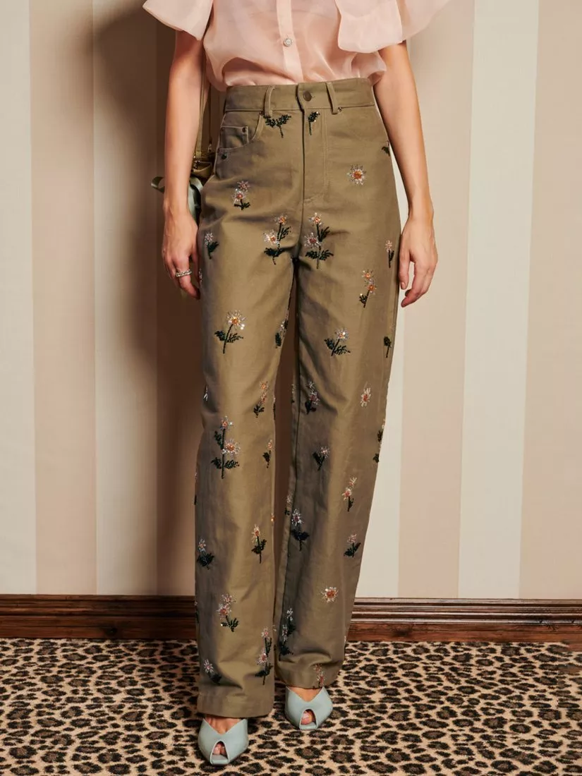 High-waisted jeans in a woven drill fabric with all-over sequin daisy embellishments. Detailed with front pockets, belt loops and front button fastening.