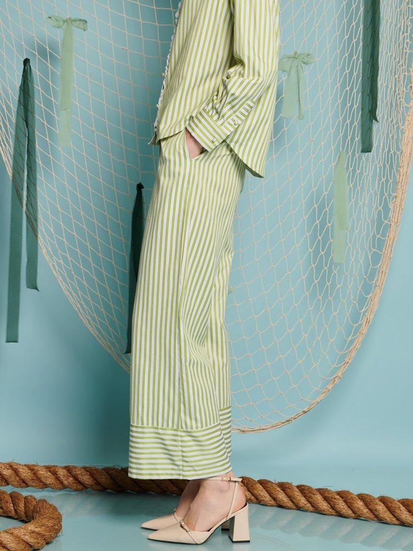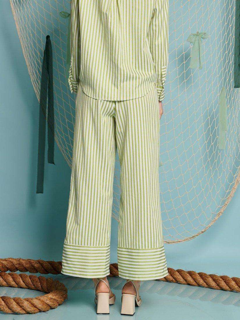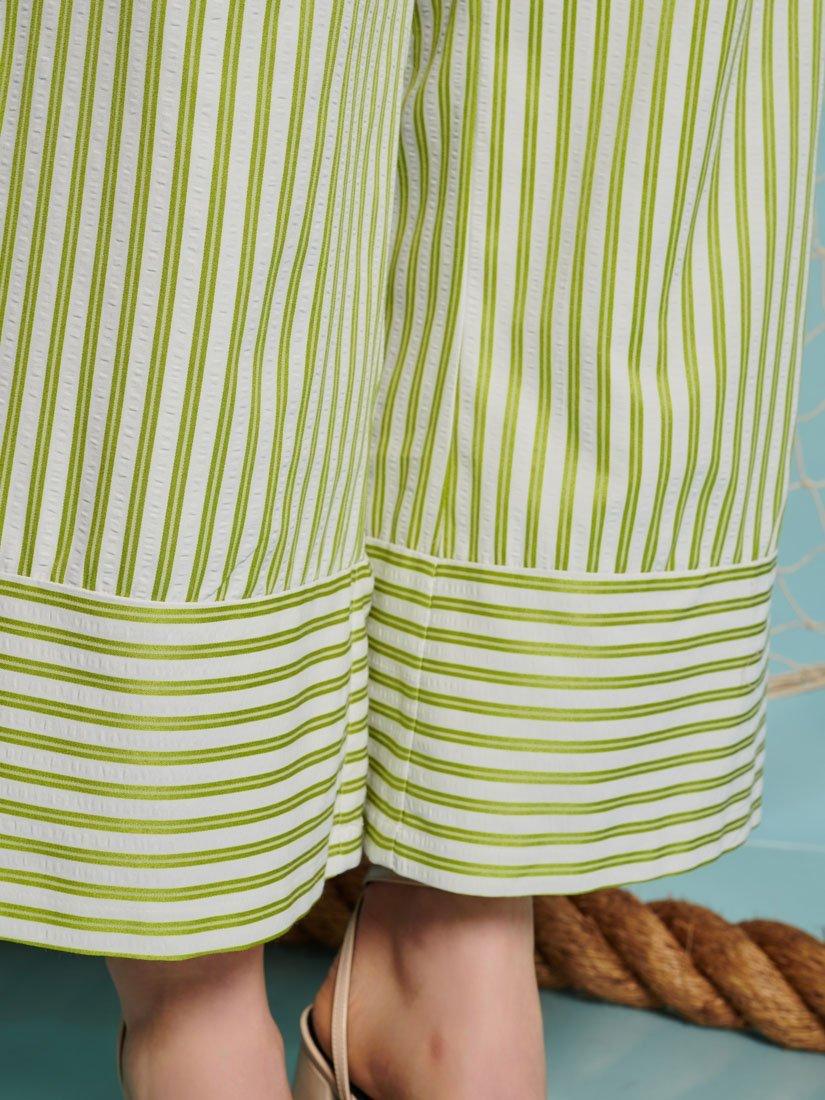 Wide leg trousers in a seersucker striped woven fabric. Detailed with side seam pockets and a hem panel in contrast stripe direction. Fastened with a zip and fly with a concealed hook on the waistband.