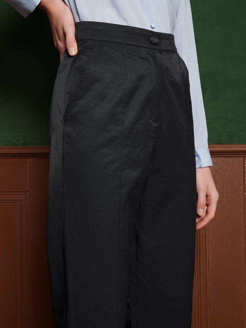 High-waisted trousers in a structured taffeta fabric. Detailed with ruffled hems and finished with side and back welt pockets.