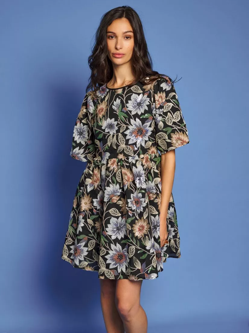Mini length dress in a sequin-embroidered lightweight woven fabric. Fully lined and detailed with three tie details down the centre back.