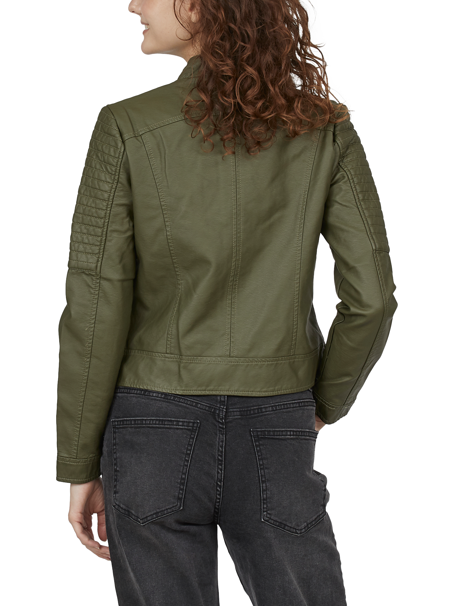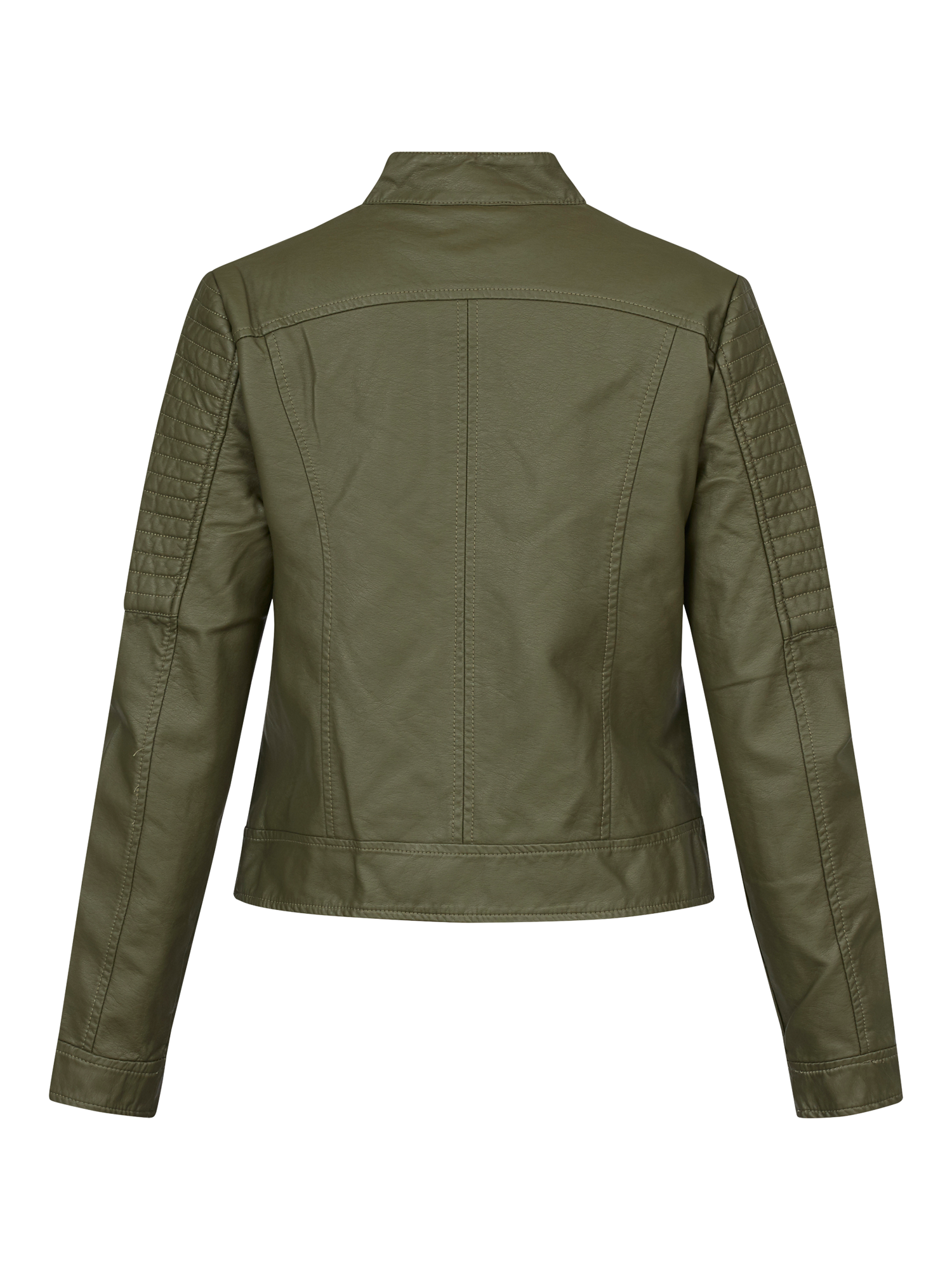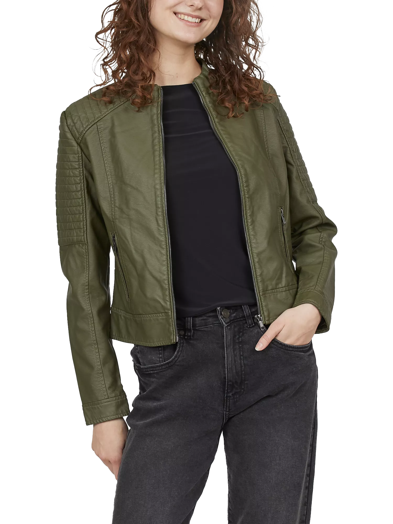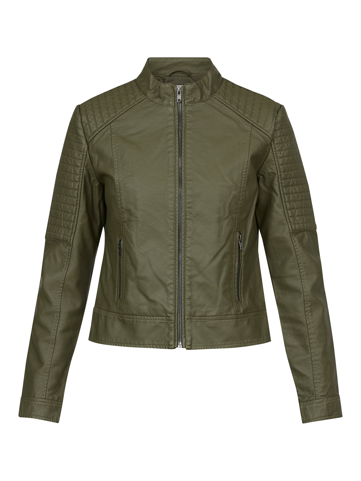 With a round neck and a zip up front, it's coated with faux leather and features quilted detailing on the shoulders and sleeves.