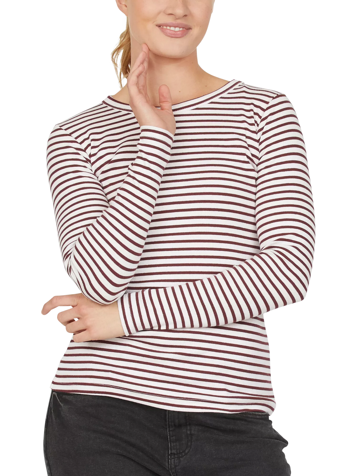 A solo piece or layering staple, this ribbed stripe top by Sisters Point is simply cut from a soft cotton blend with a round neck and long sleeves.