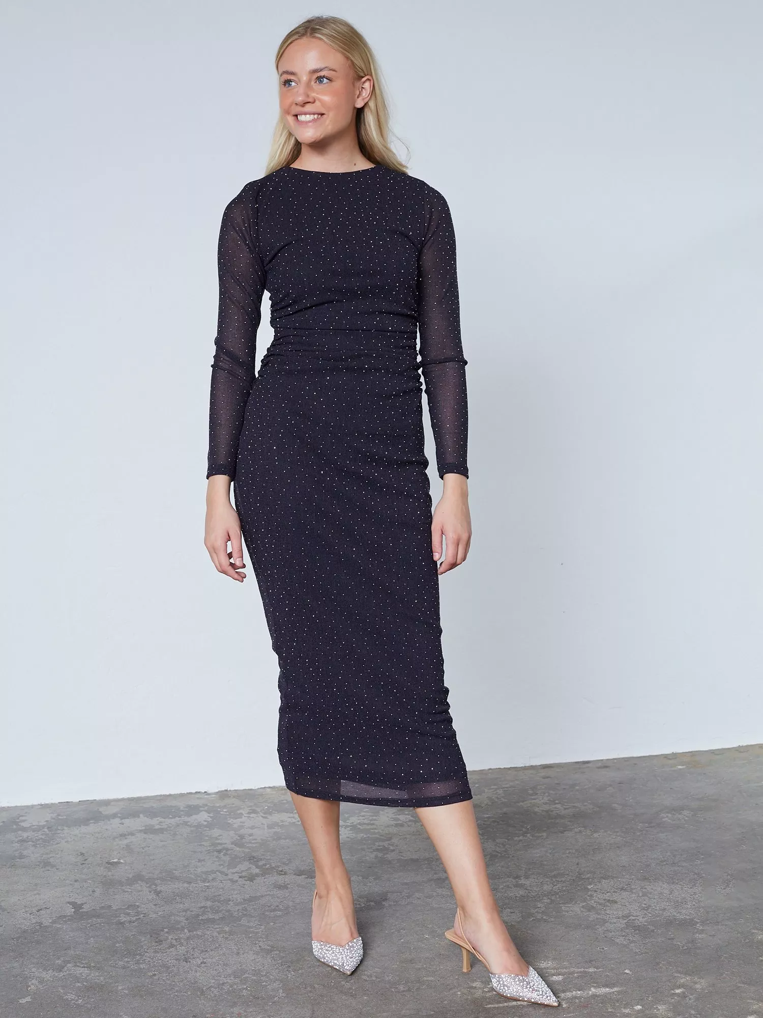 A ruched waist mesh bodycon midi dress from Sisters Point. Its polka dot and embellished accents offer a clever twist, while a sewn-on petticoat prevents it from being see-through.
