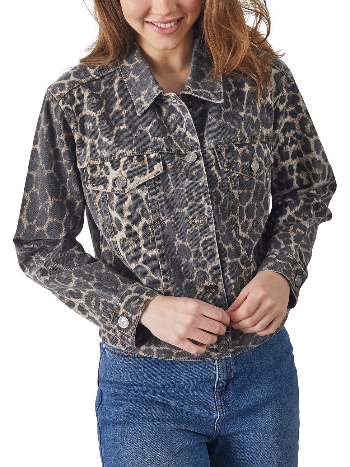 Embracing latest trends with its animal print, it is fashioned from denim with a classic collar for ultimate casual appeal.