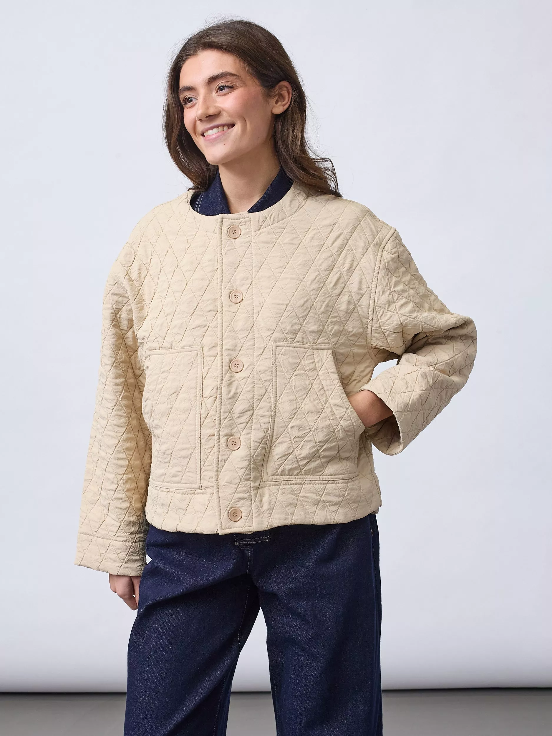 Lisana is a quilted jacket in a lightweight, structured material with a classic check pattern. The jacket has a modern, boxy fit, button closure at the front and functional patch pockets.