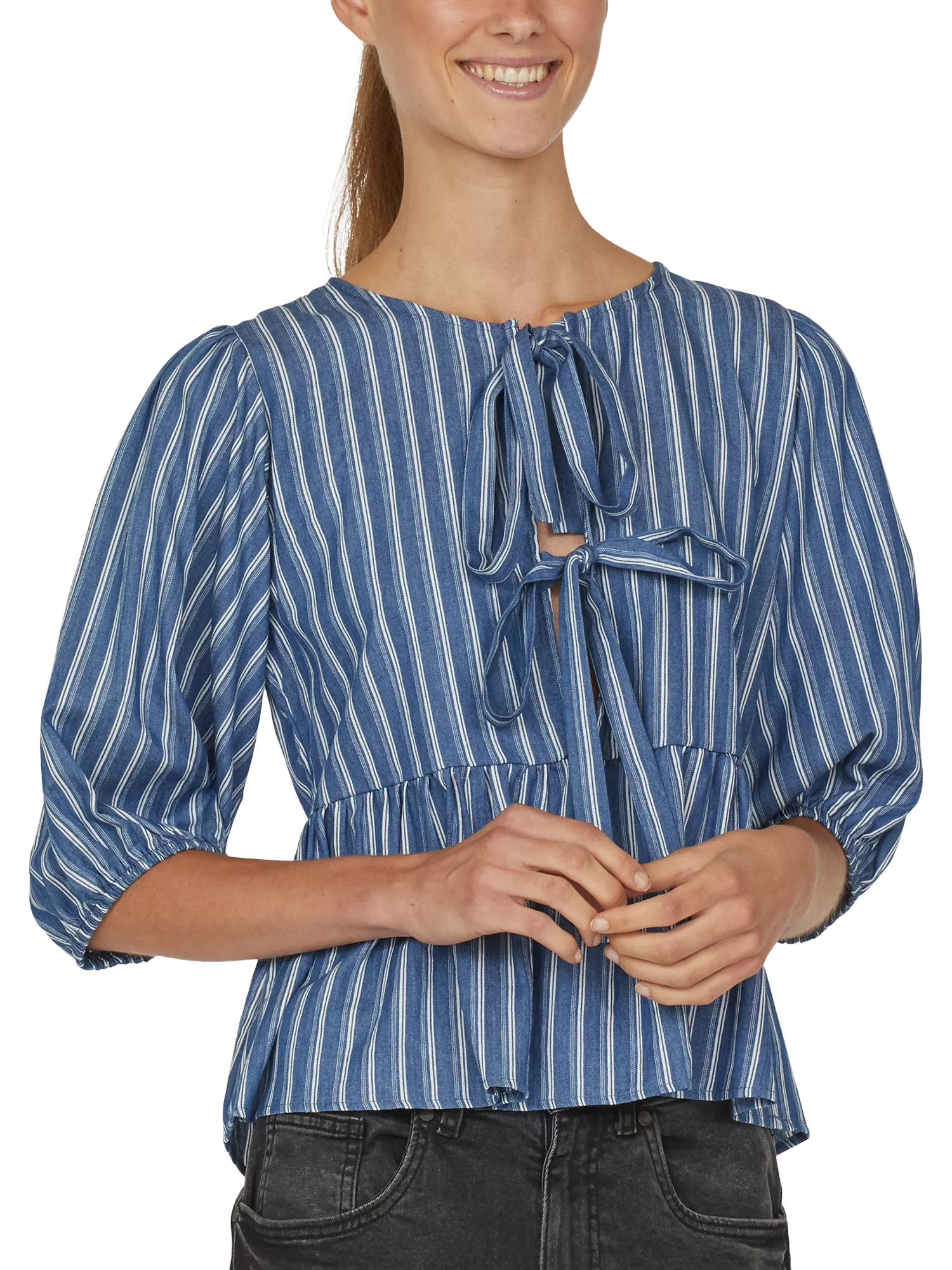 The Nell is an elegant blouse with stripes. Round neckline with tie at the front, three-quarter sleeves and flared hem.