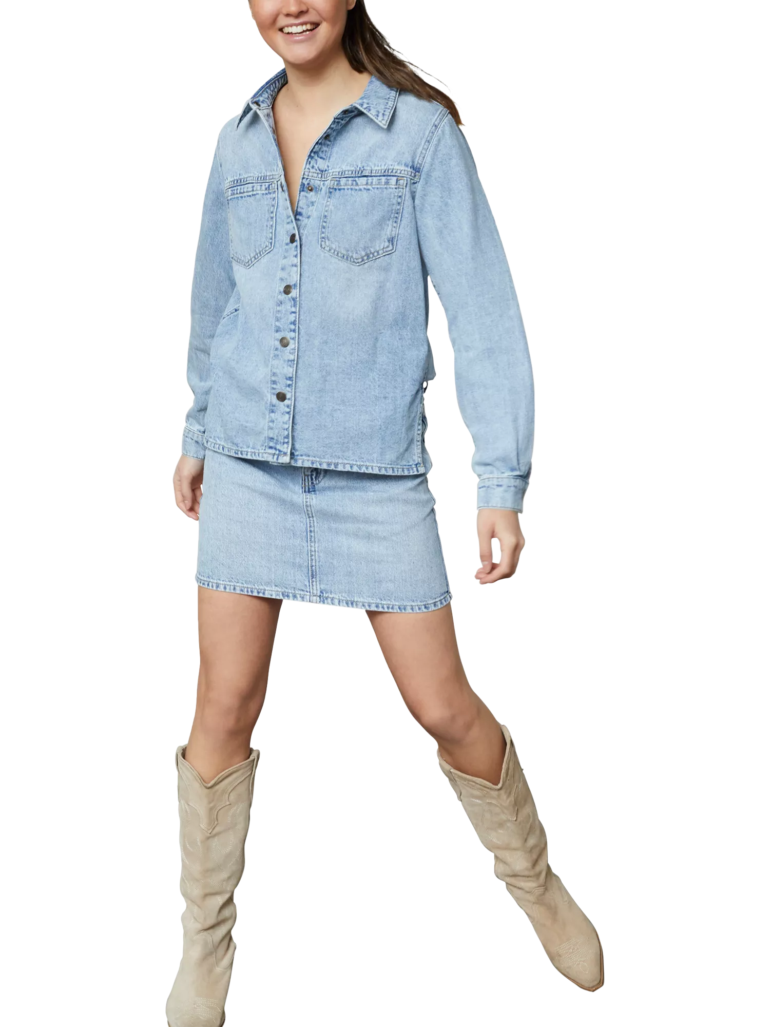 The Odia is a cohesive set consisting of a top and a skirt in denim. The top is a shirt with long sleeves, collar and buttons.