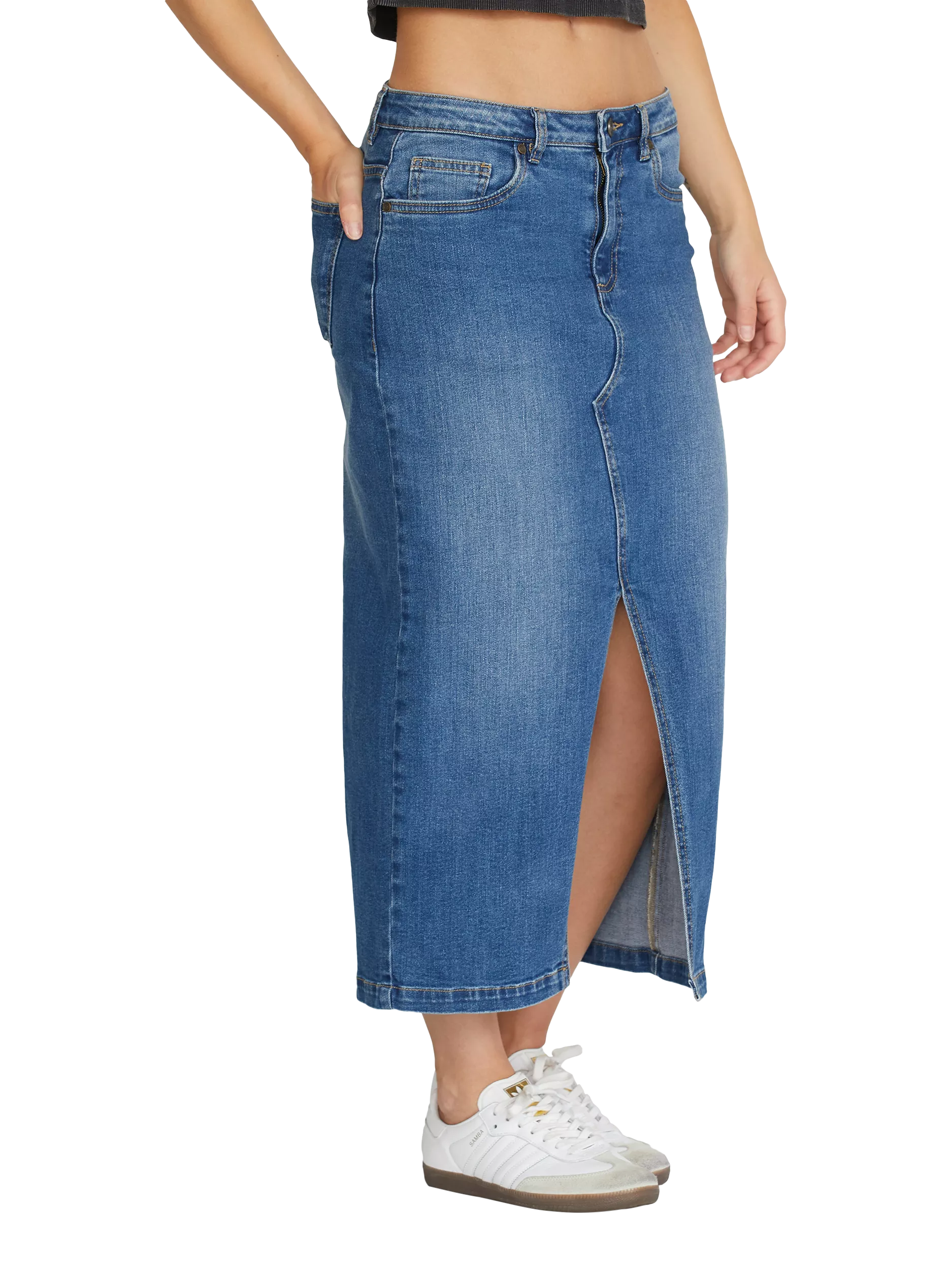 Cut to a fitted silhouette with an open slit through the front, this denim midi skirt by Sisters Point sits comfortably at the waist for a great everyday option.