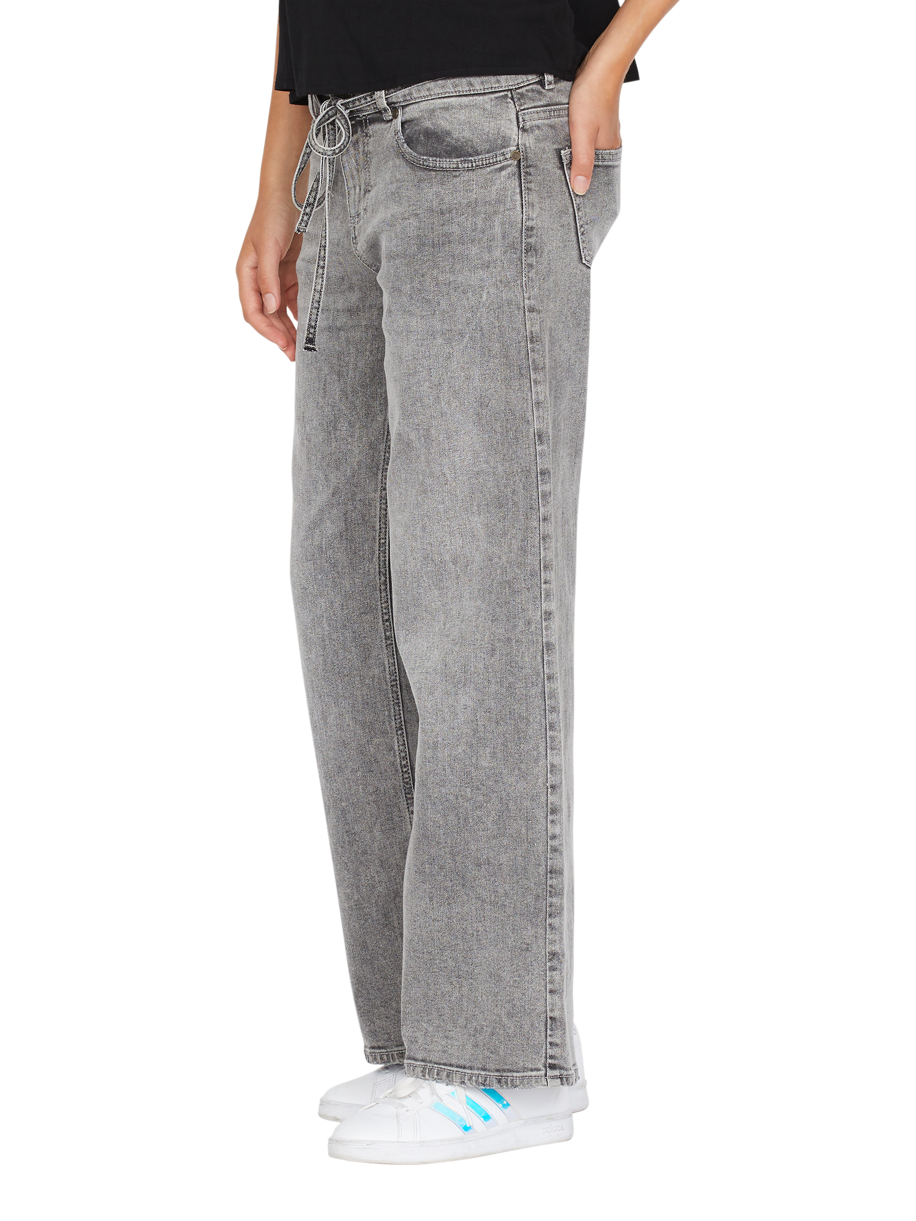The Onea is a denim pant with wide legs and a removable denim belt at the waist.