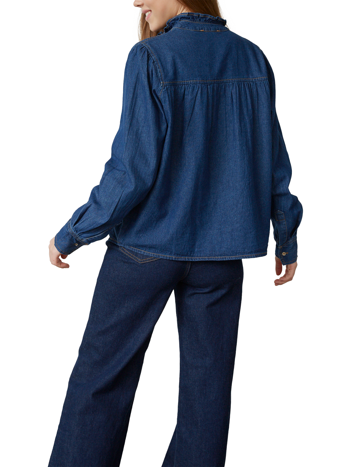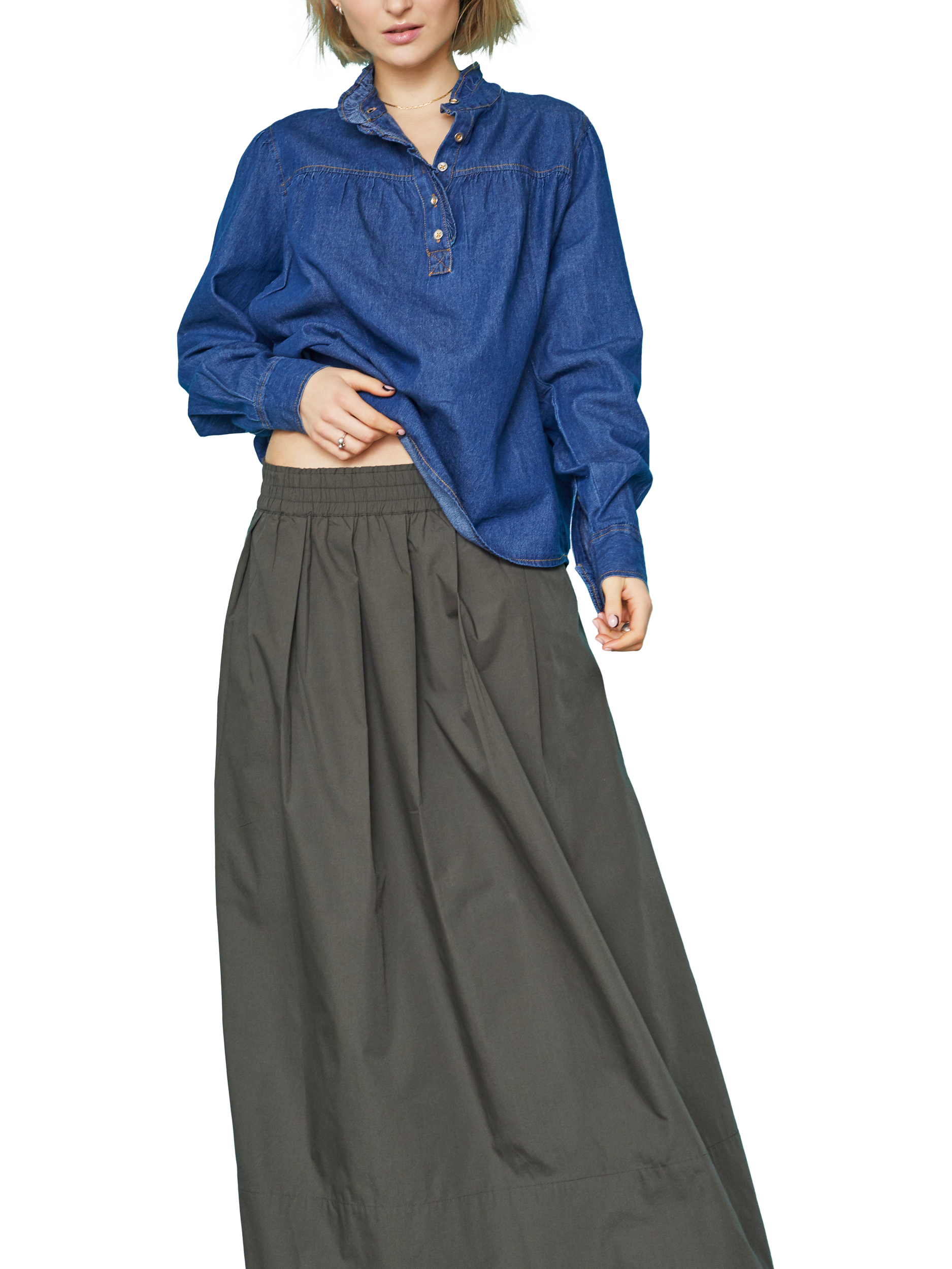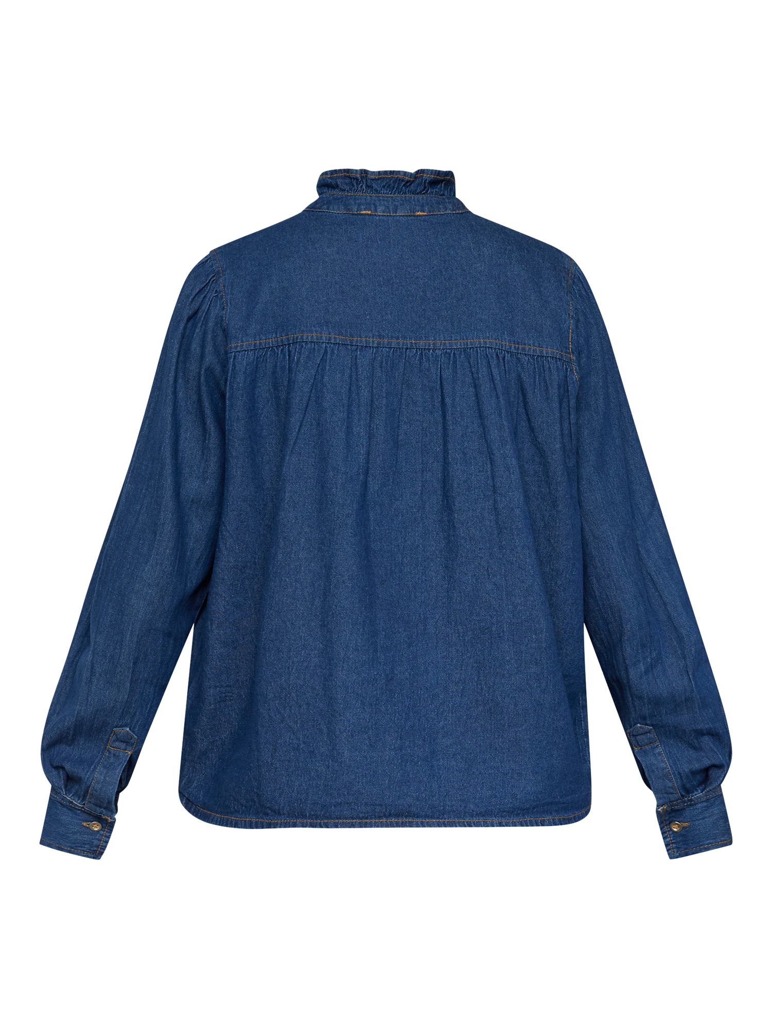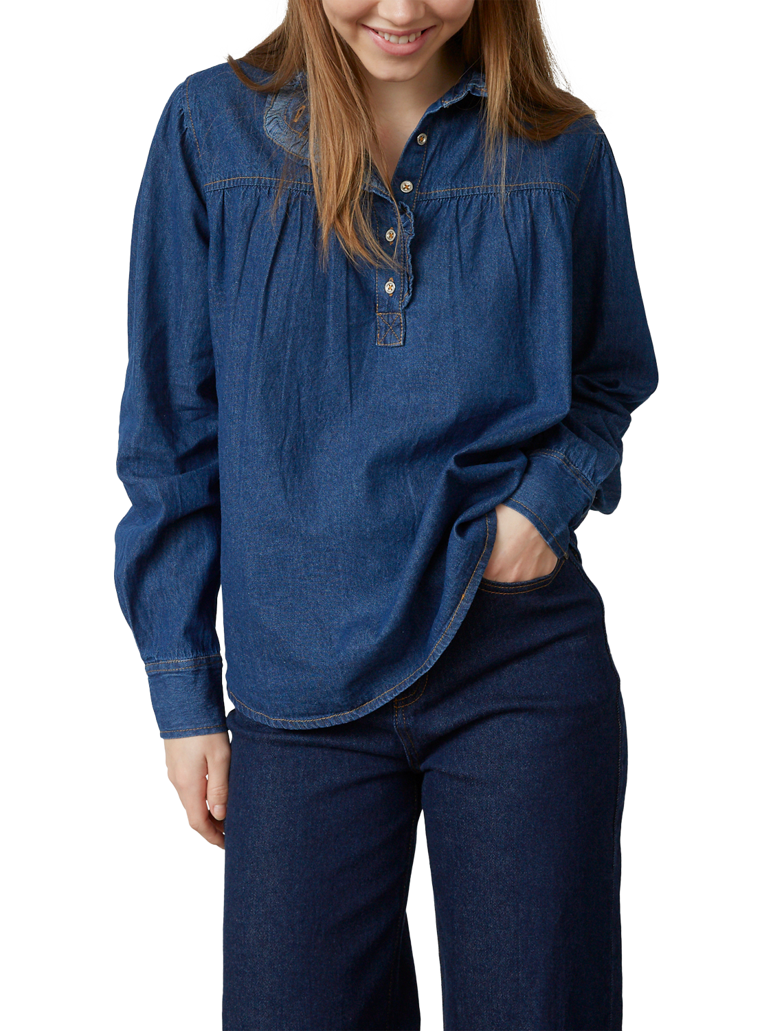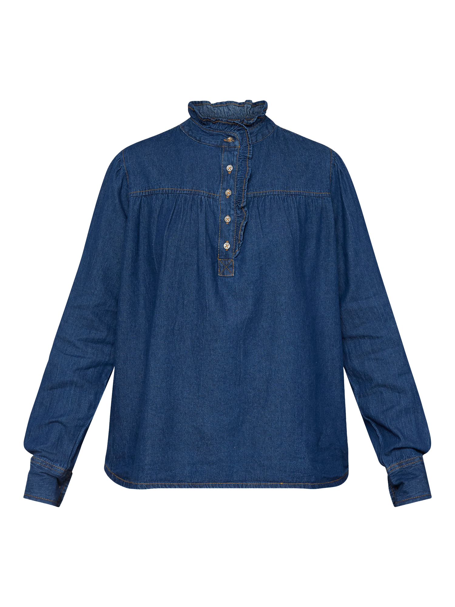 The Ubisa is a feminine denim shirt with a high collar. The shirt has long sleeves and a short button closure at the neck.