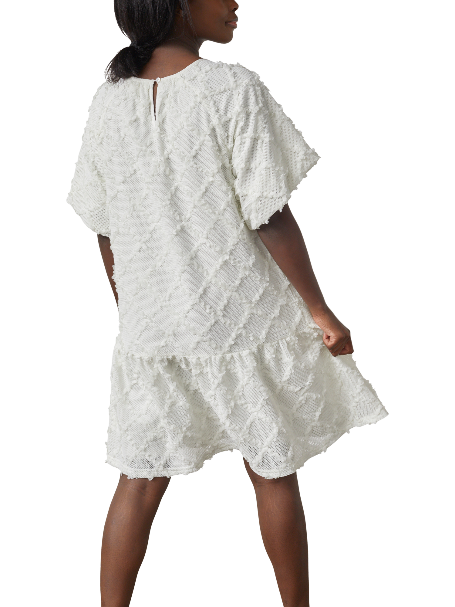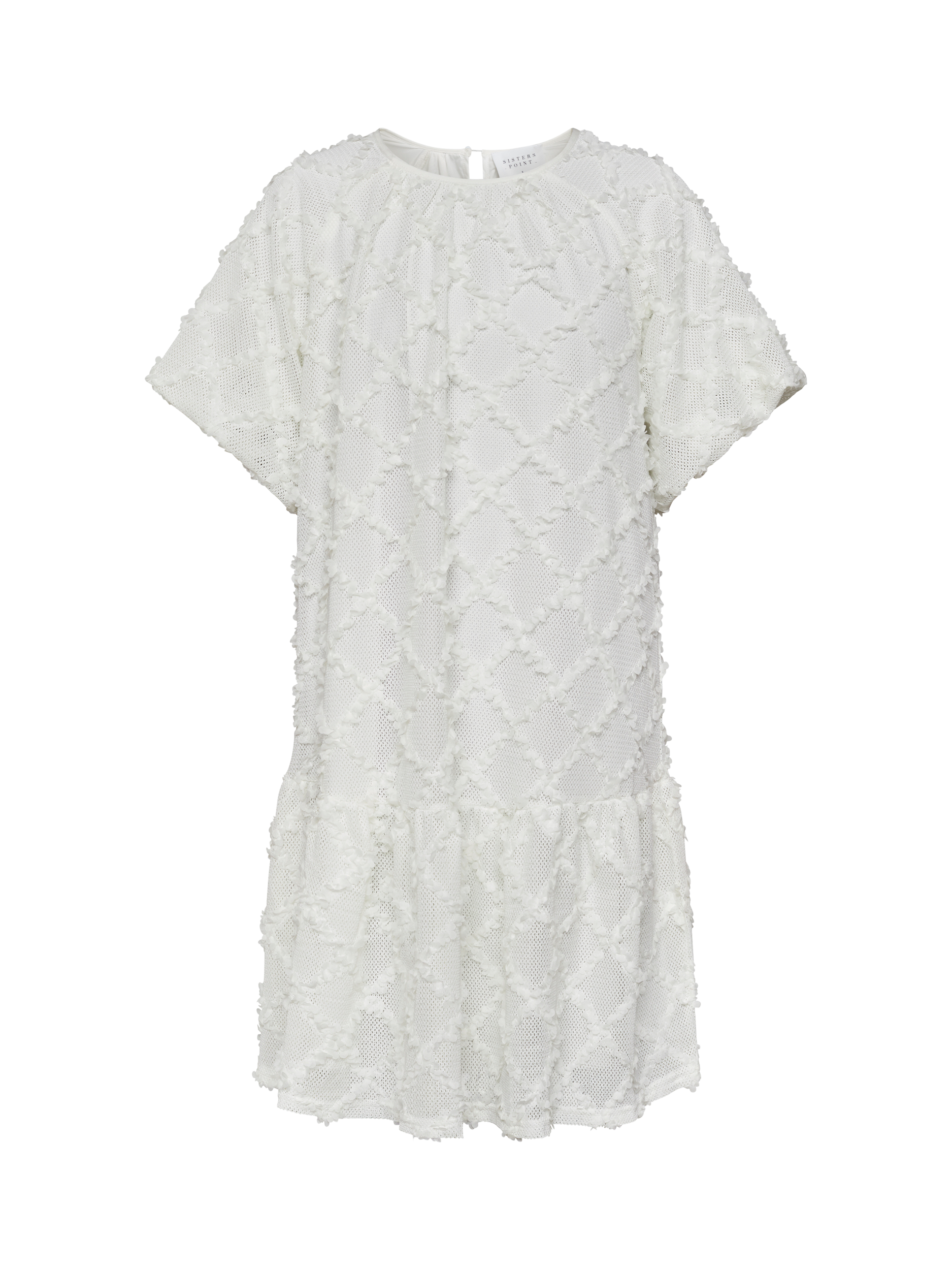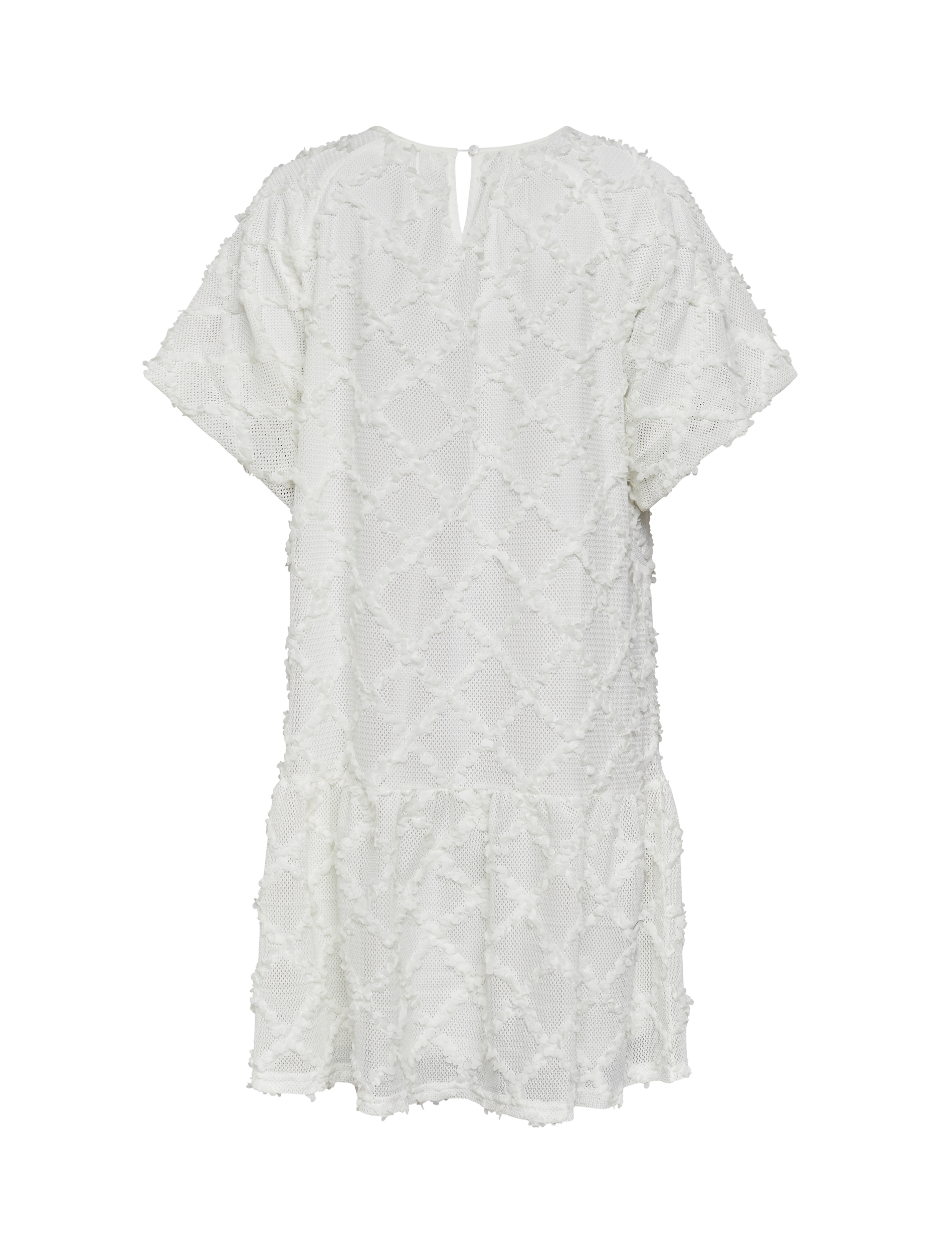 The Vai is a unique and textured dress with a modern design. The dress has a round neckline and short sleeves. The textured material gives the dress an exclusive look.