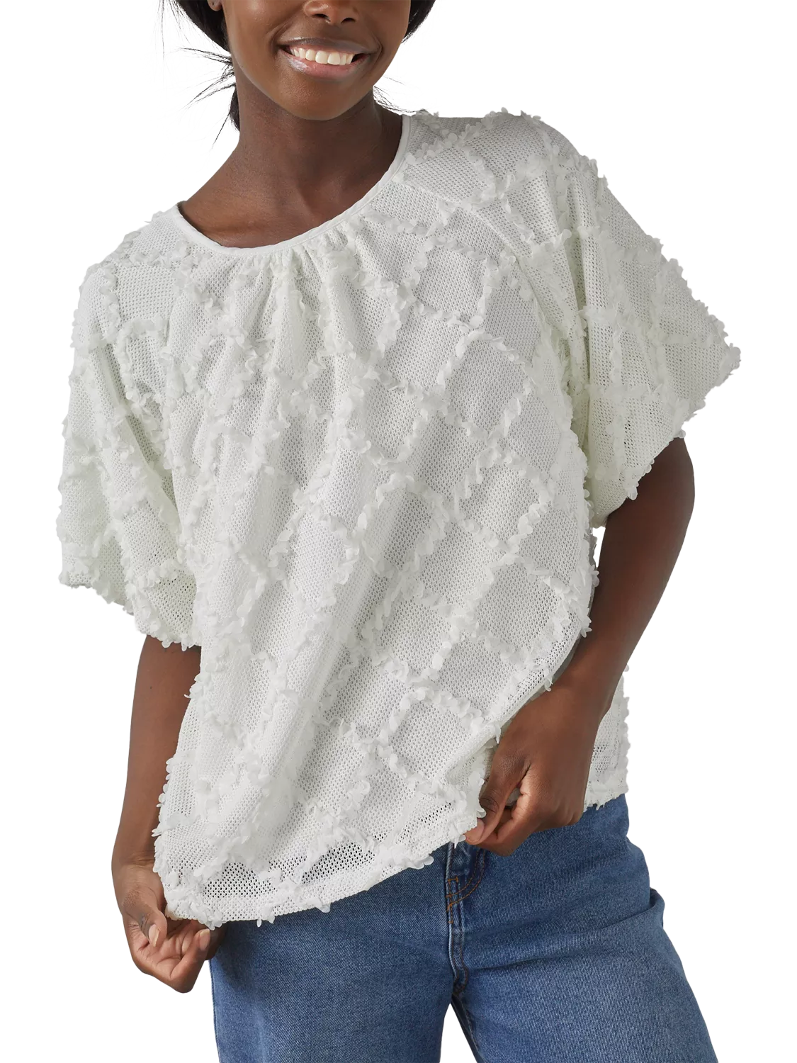 The Vai is a unique and textured blouse with a modern design. The blouse has a round neckline and short sleeves. The textured material gives the blouse an exclusive look.