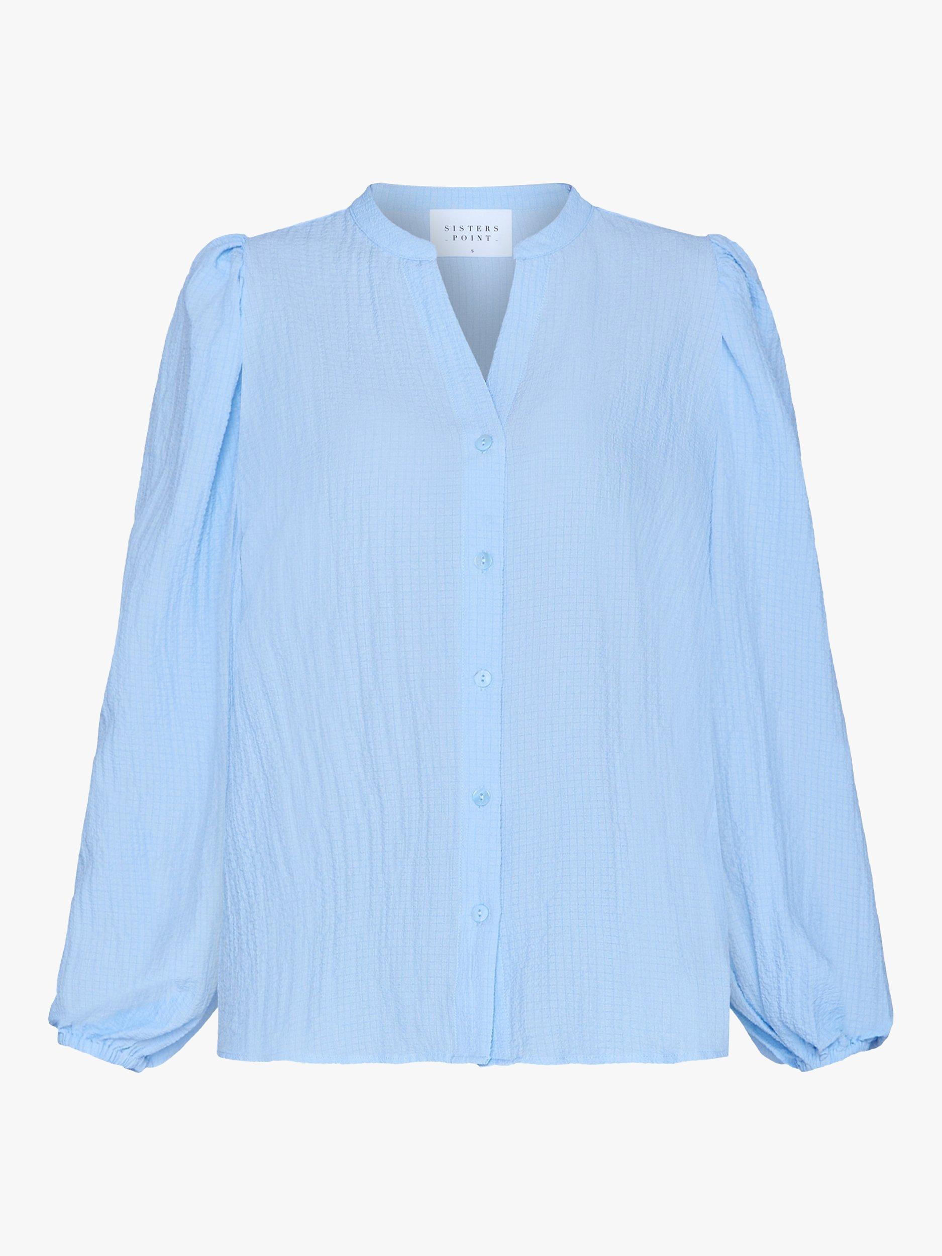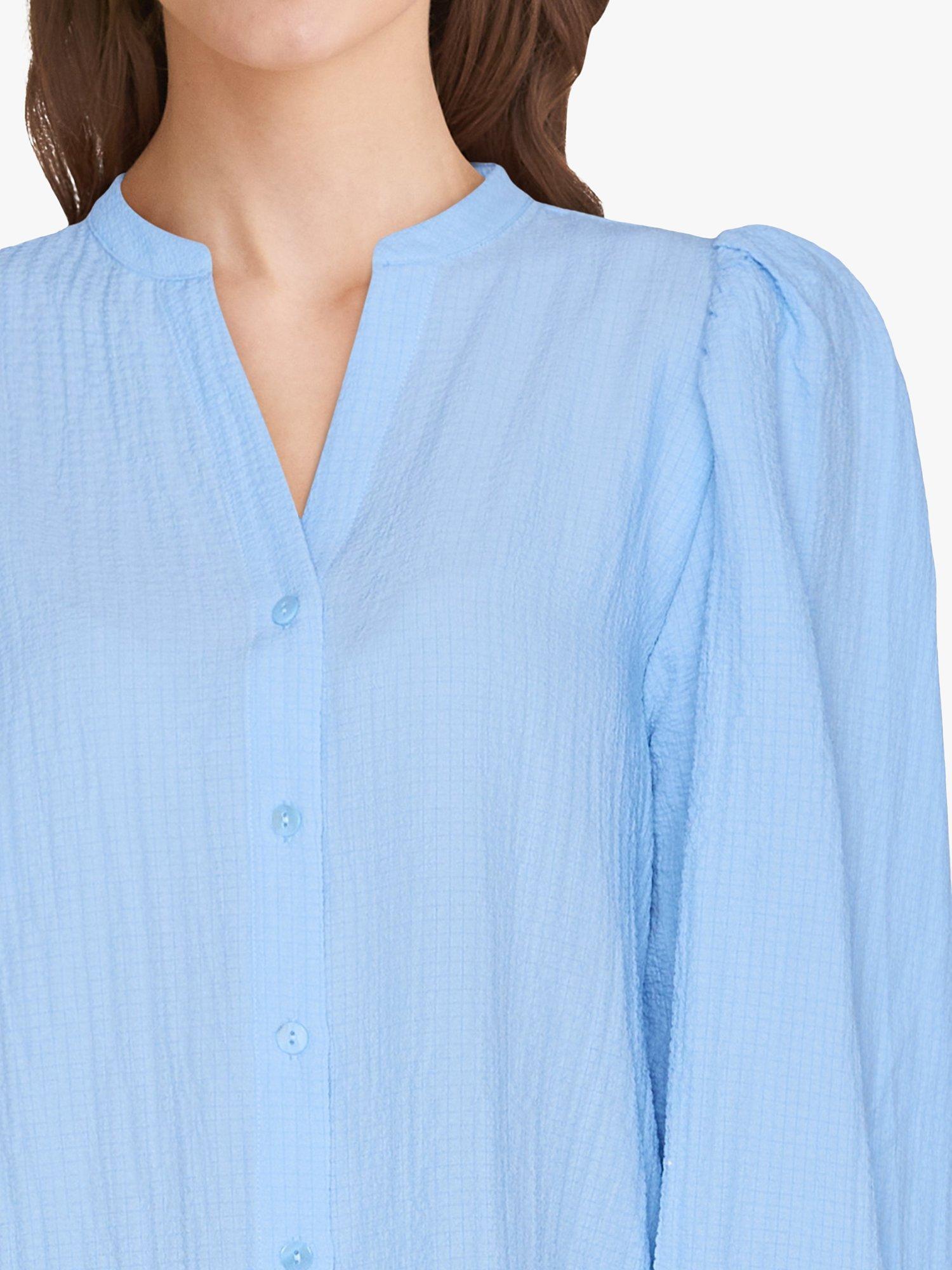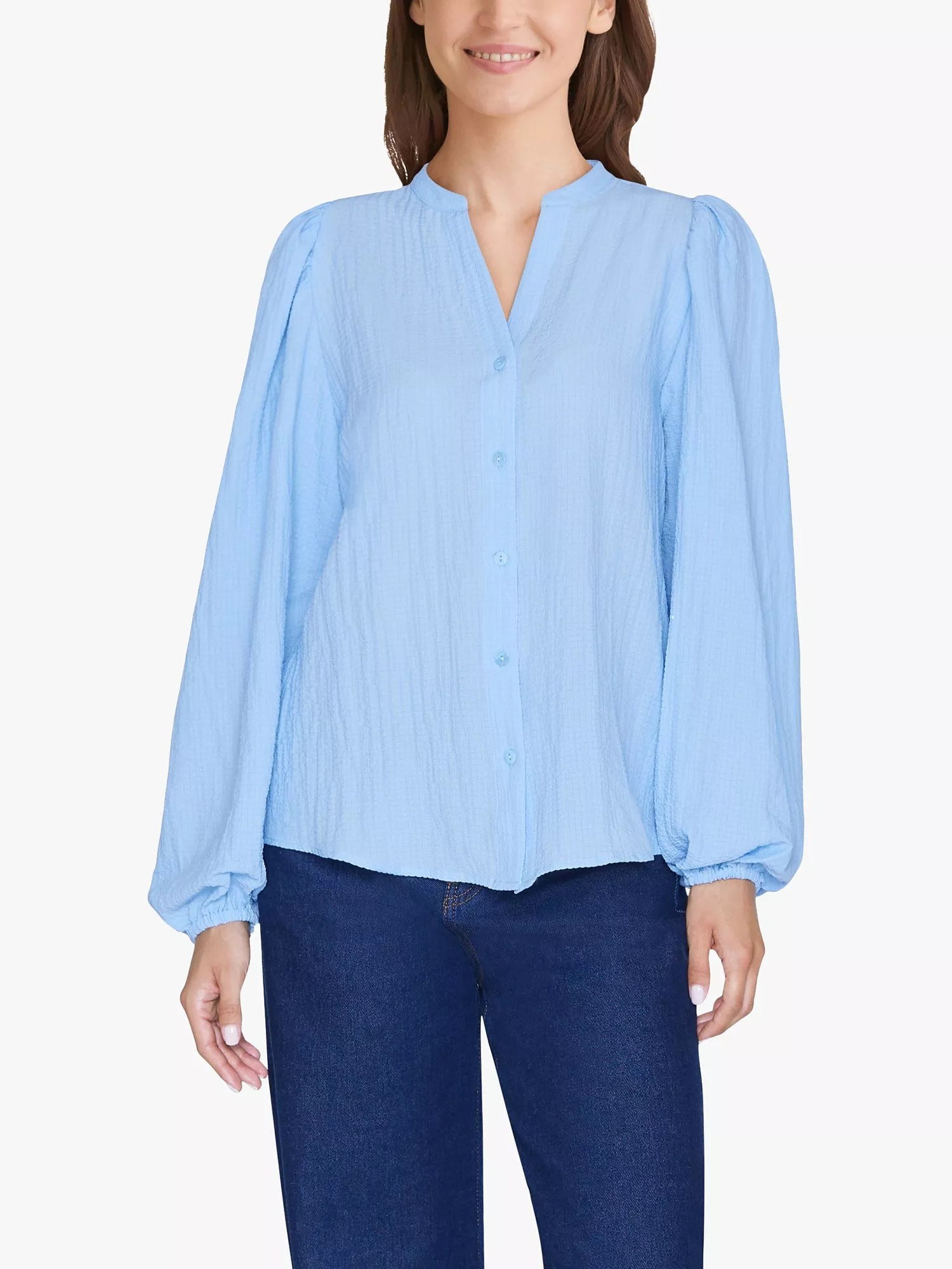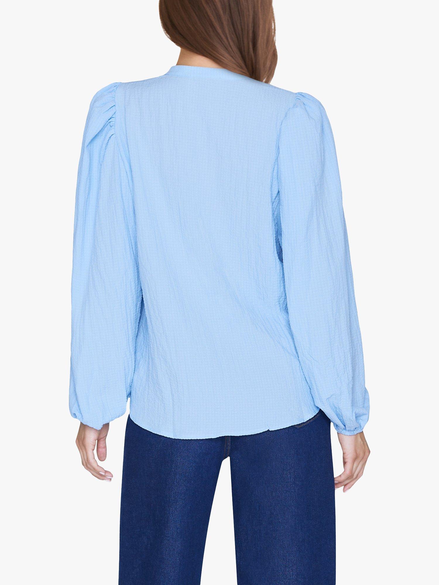 Cut with a classic v-neck and long puffy sleeves, it is made with light yet robust blended fabric for longevity of wear and is an easy daytime option.