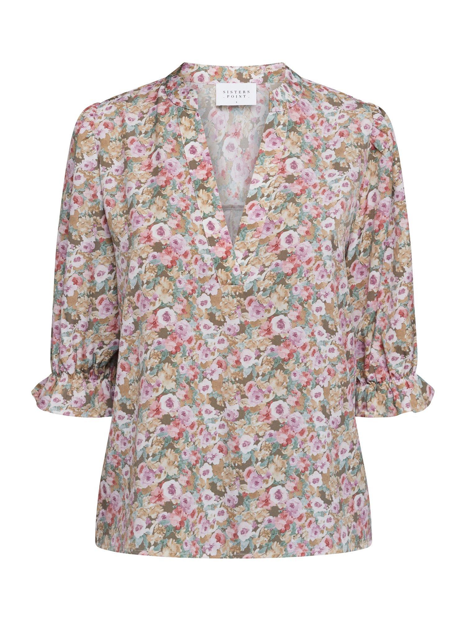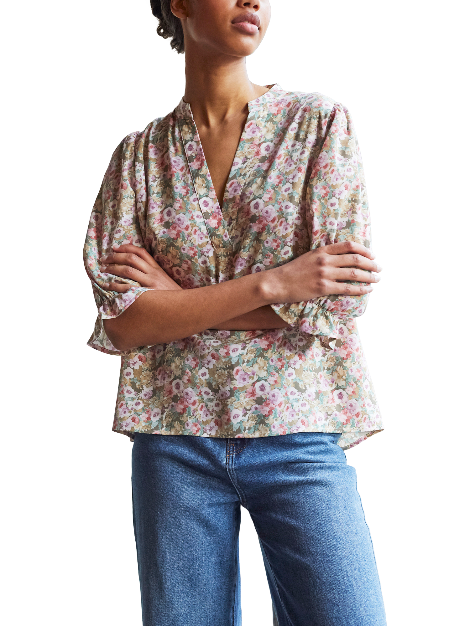 The Venny is a feminine and elegant blouse with a romantic floral pattern. The blouse has a deep V-neckline and short puff sleeves with ruffles. It is made of a light and airy material.