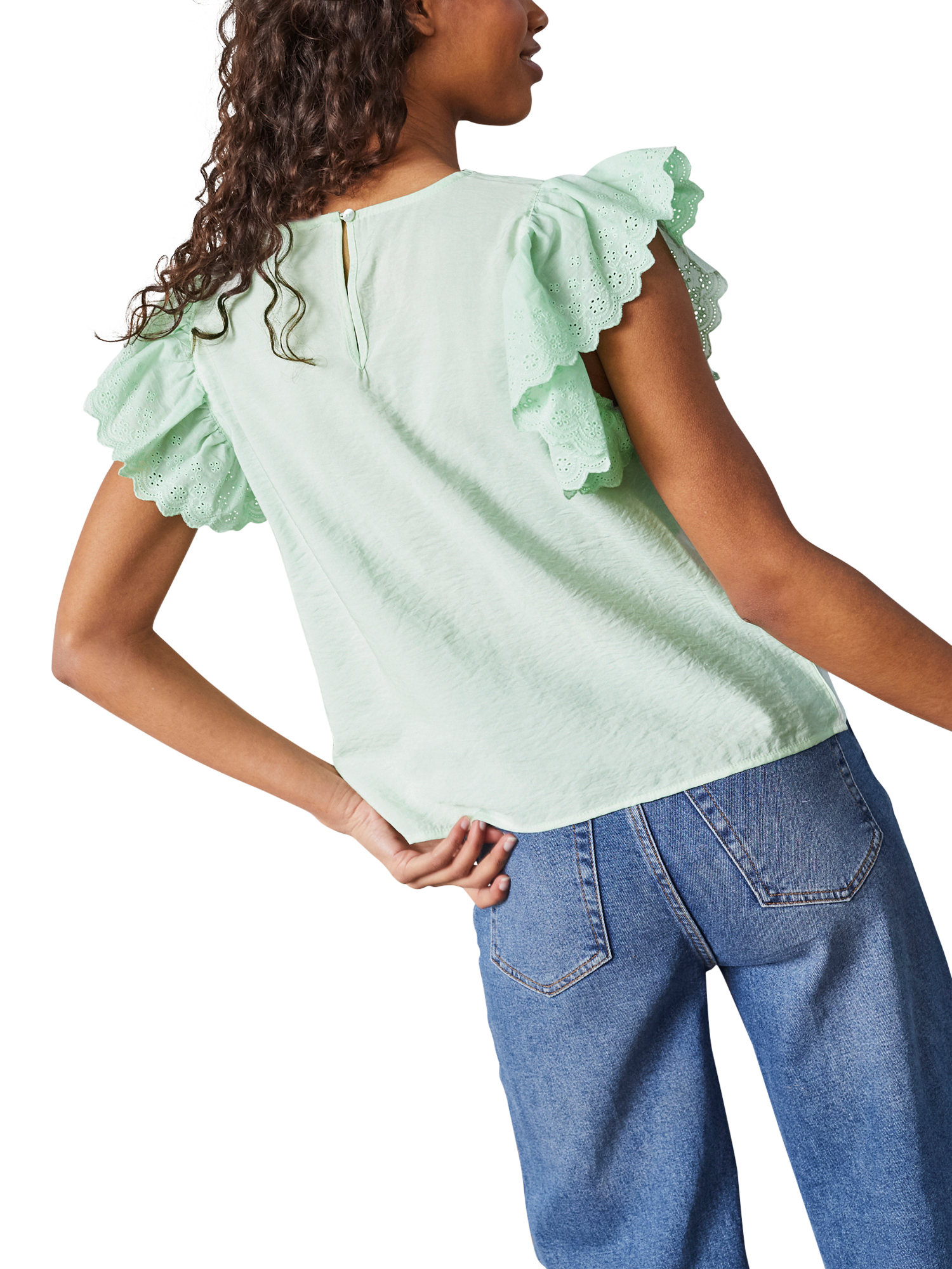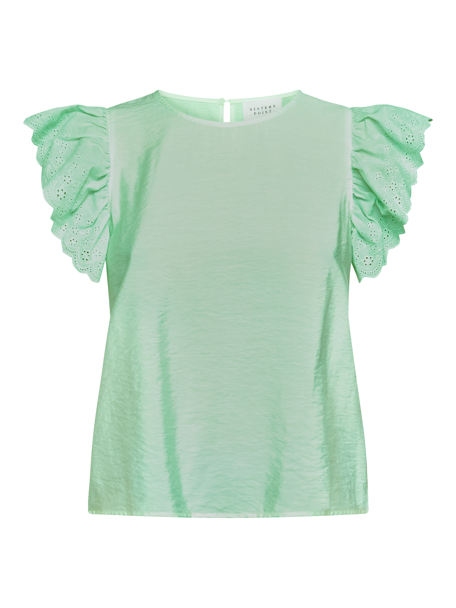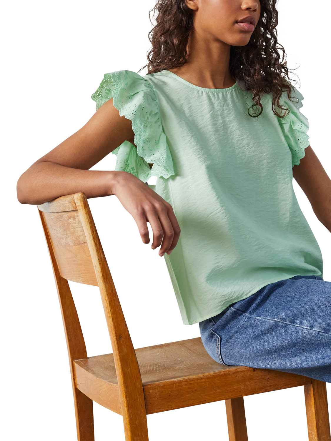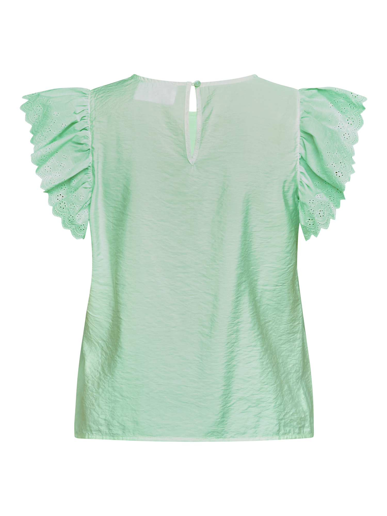 The Vidar is a feminine and elegant top with short sleeves and a round neck. The sleeves are adorned with fine ruffles and broderie anglaise that add a romantic touch.