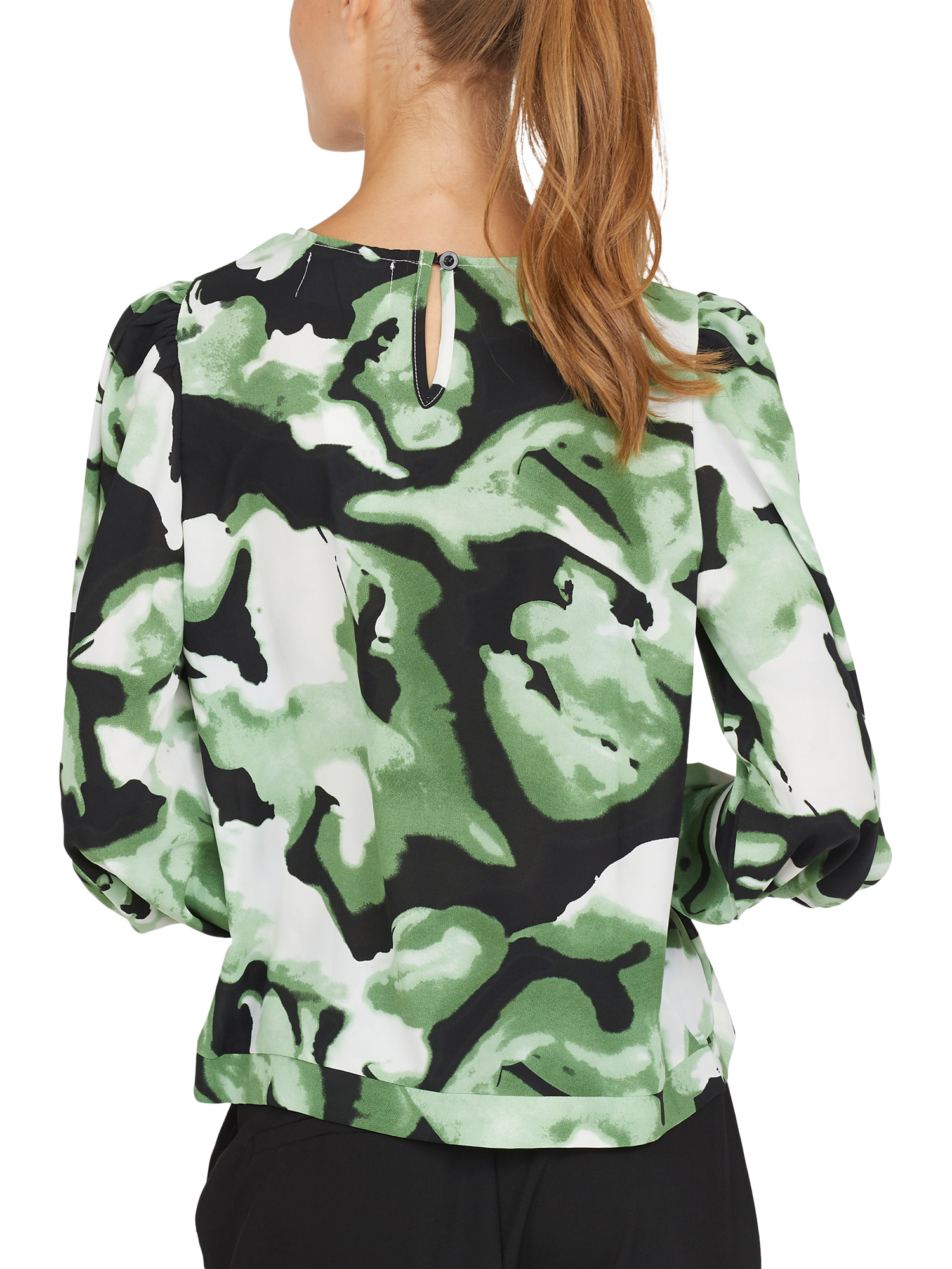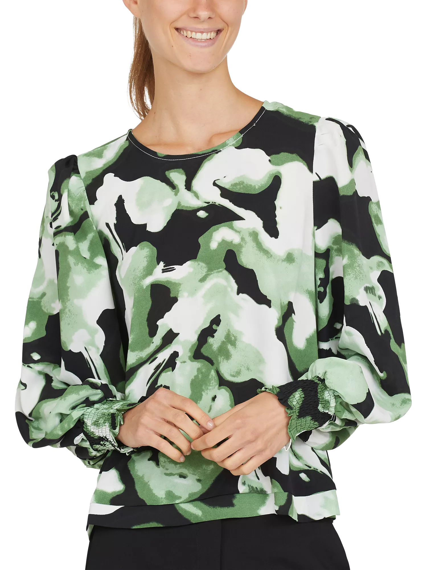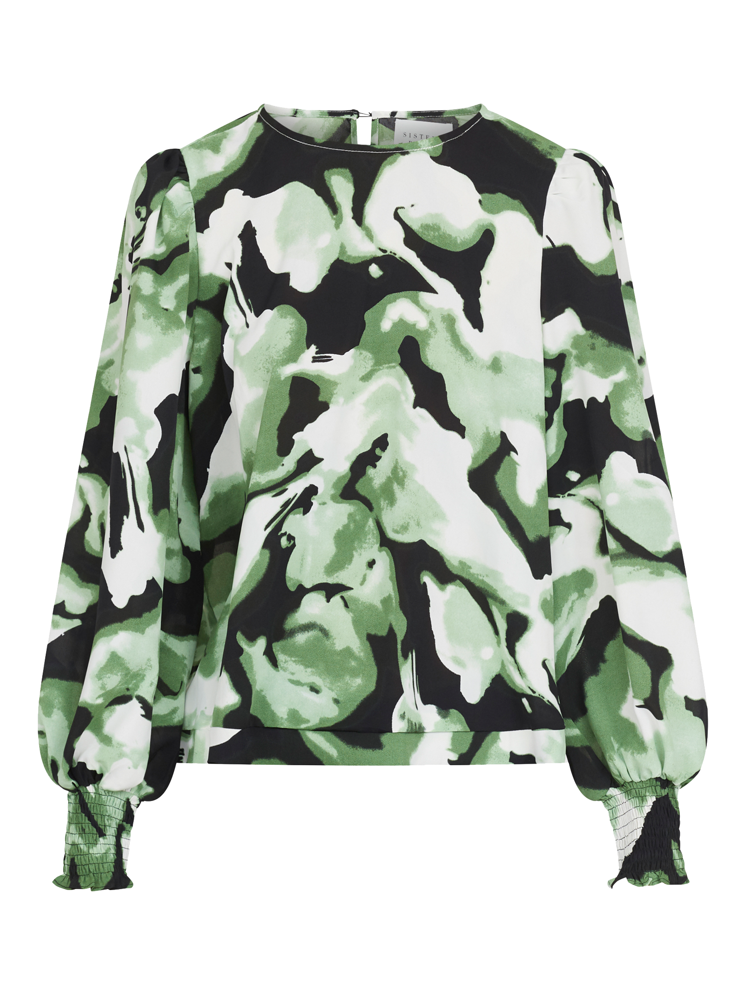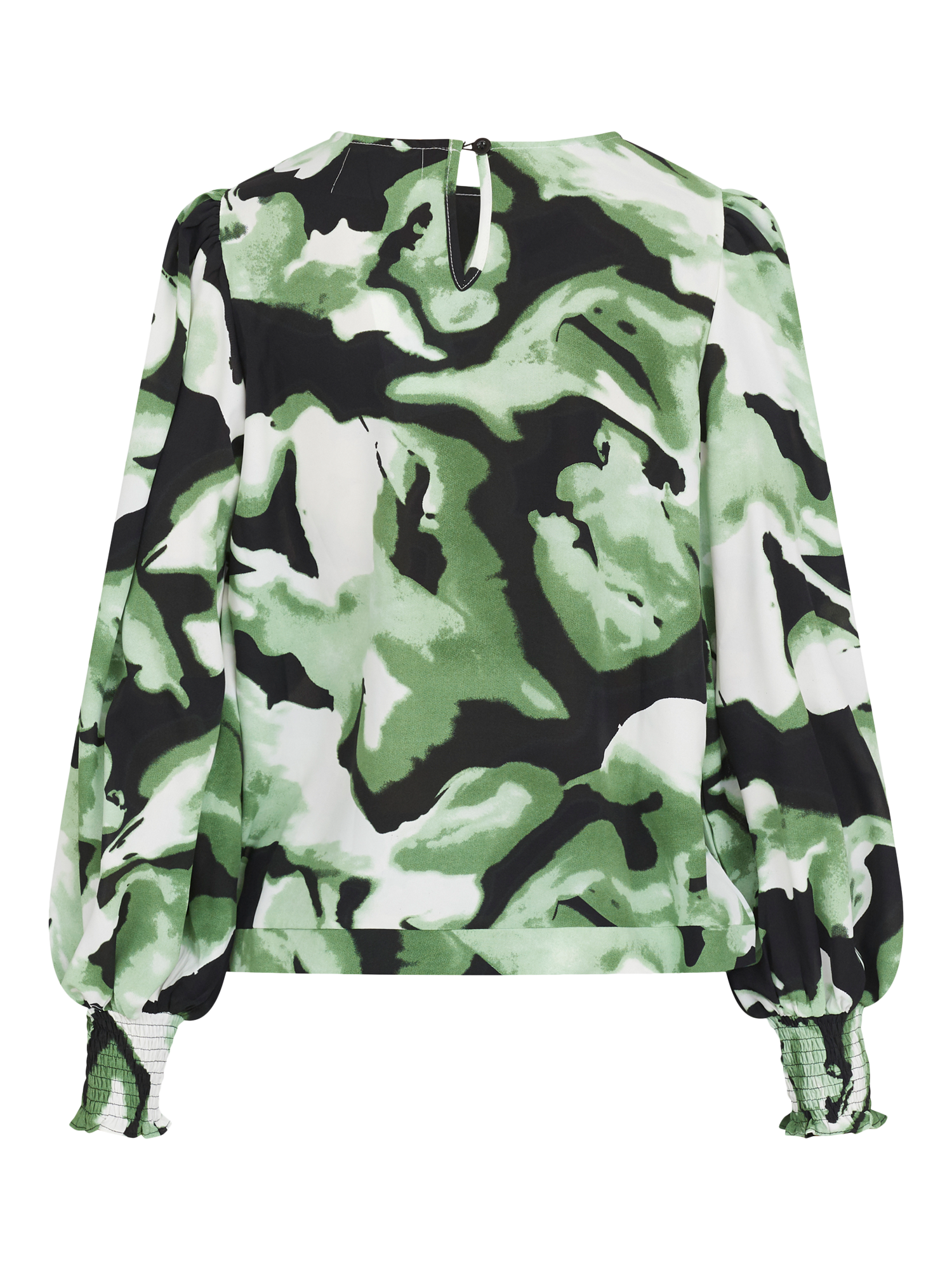 The Vinasa is a graphic printed blouse with a loose fit. The blouse has a round neck and smock at the sleeves.