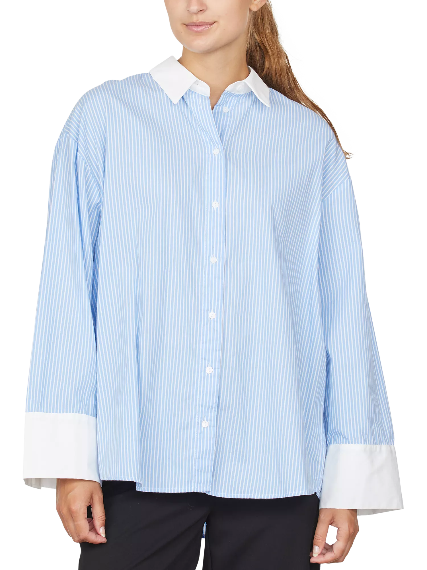 The Viska is a striped shirt with a wide fit. The shirt has a white collar and cuffs, and a button closure down the middle.