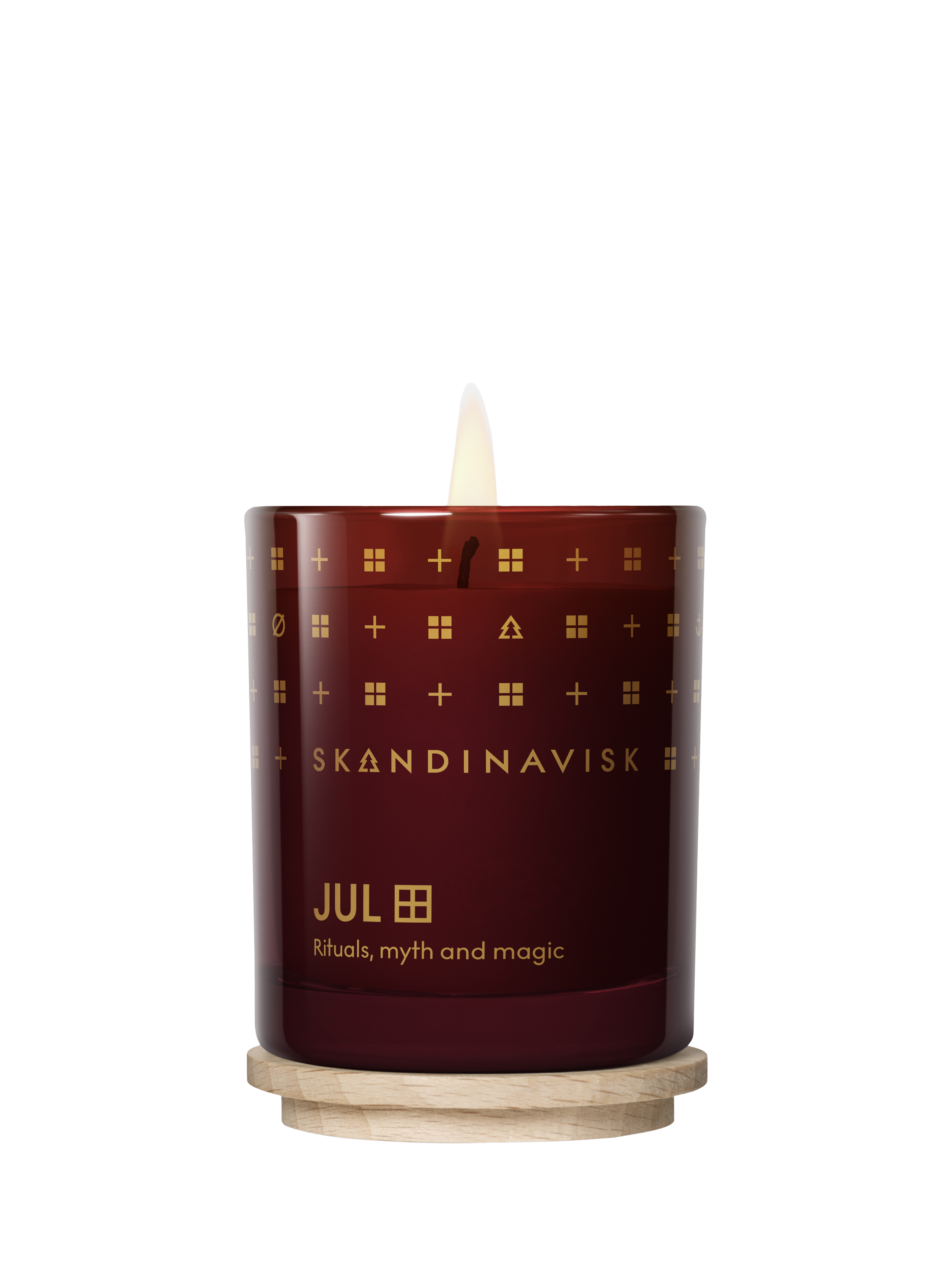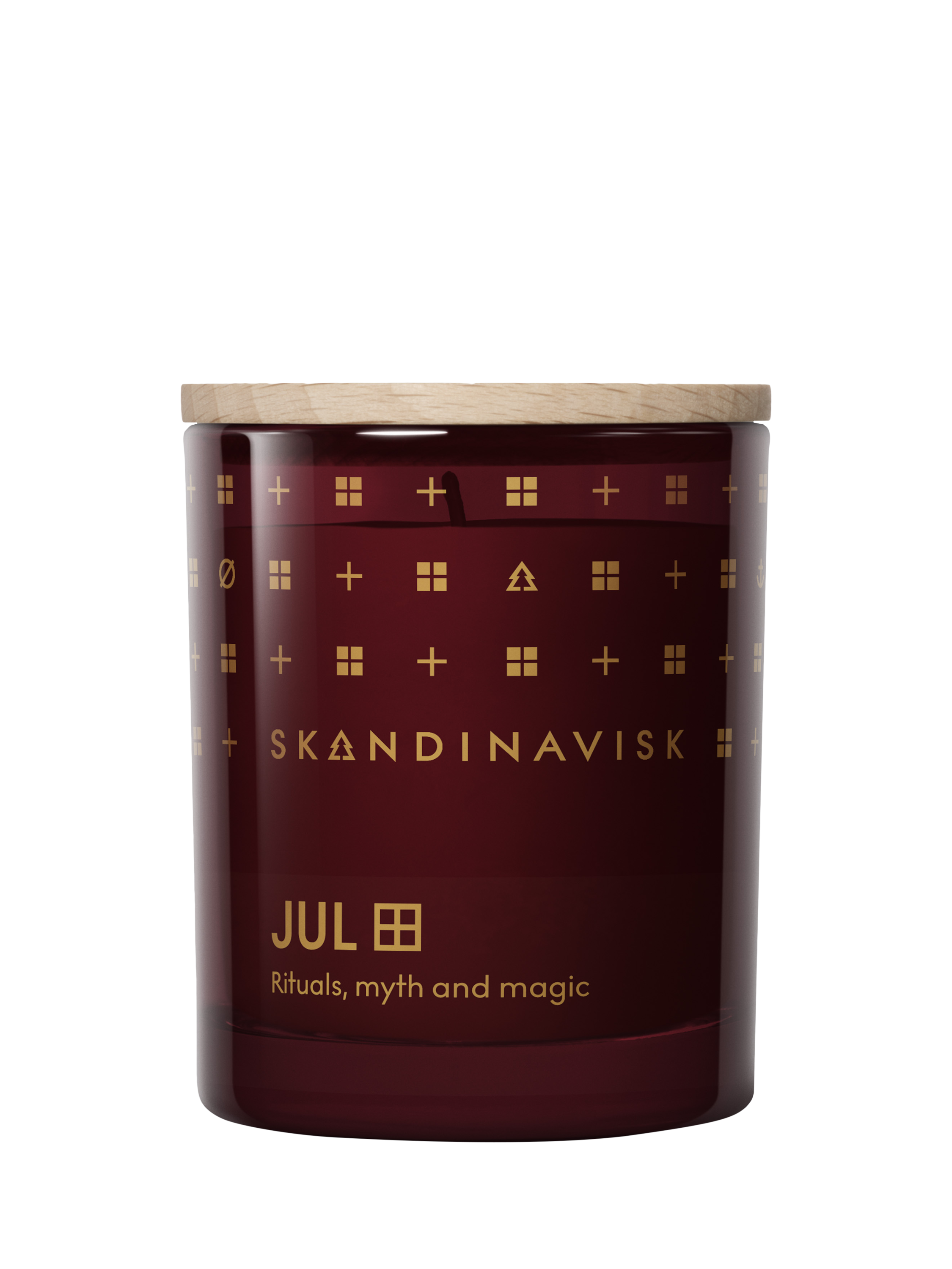 Special edition scented candle in seasonal design and box. Wax sourced from Swedish rapeseed oil that is non-GMO, and blended to burn stably and slowly. Vegan and cruelty free blend. Poured into a painted glass votive with pure cotton wick and engraved FSC-certified beechwood lid. Packaging card and sleeve from managed Nordic forests with natural colour dyes.